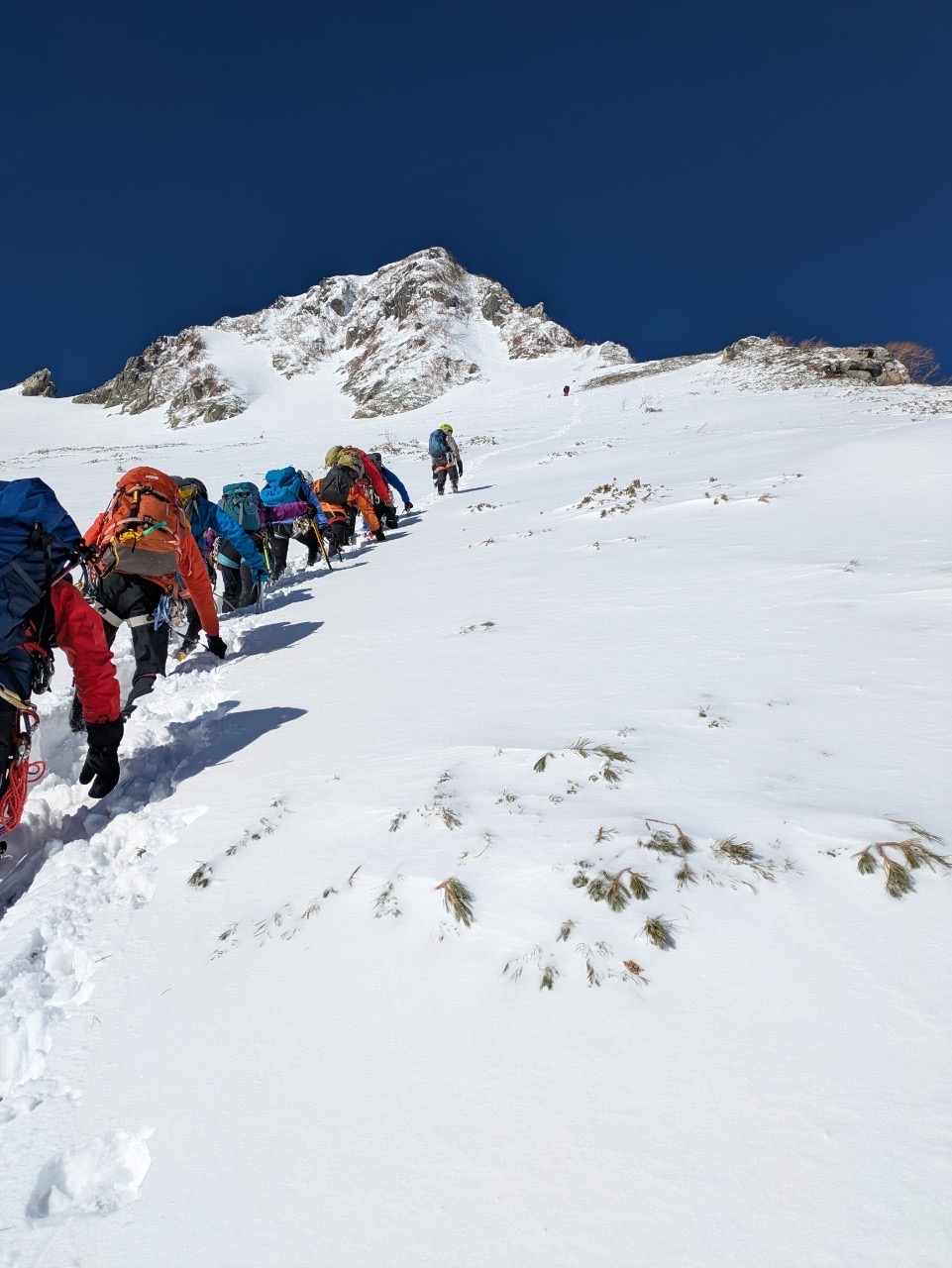 記録(冬の山登り), 記録(岩登り) 20250118宝剣岳 サギダル尾根 Author ymc Date 2025年1月20日 日時:2025年1月18日9:00〜13:00 場所:千畳敷周辺 天候:晴天 参加者:M戸、N澤、S藤(報告者) 去年参加した雪上訓練中に何組も登っているのが見えたサギダル尾根。冬季バリエーション初級ルートと紹介されてい