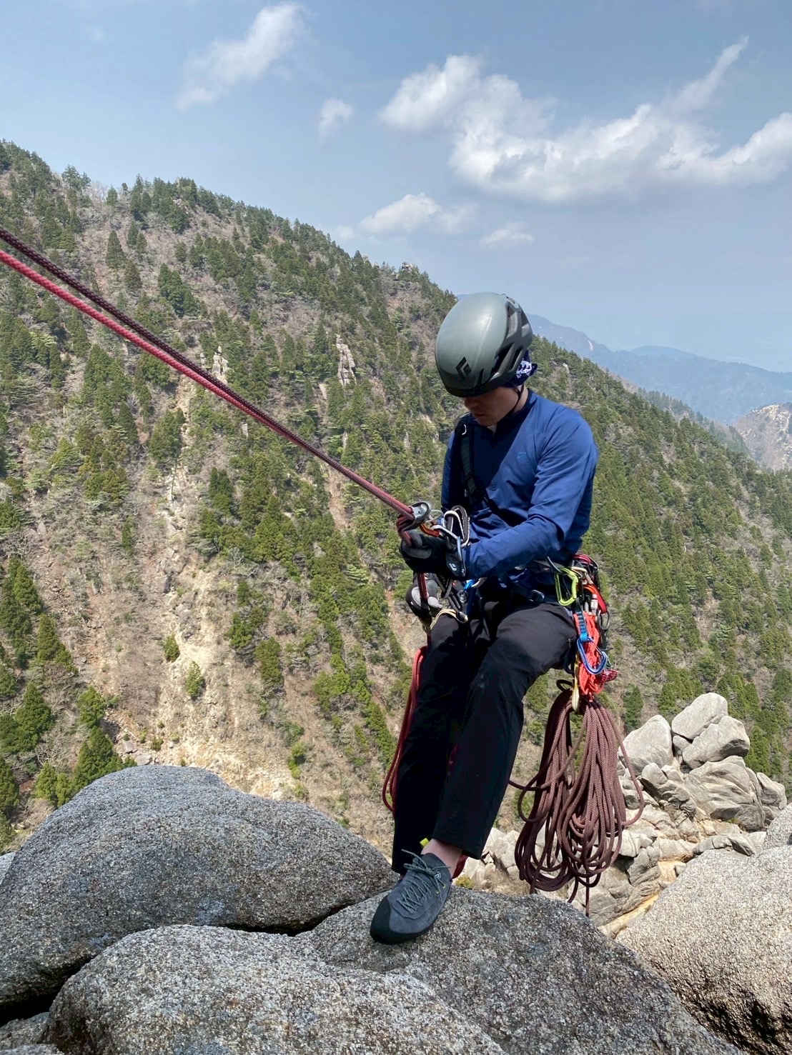 記録(岩登り) 20250419御在所前尾根 Author ymc Date 2025年4月20日 日時:2025年4月19日 天気:晴天 場所:御在所藤内壁前尾根 参加者:M戸、S藤(報告者) 先週に引き続き御在所藤内壁に。20日に早朝からの予定が有ったので、この日は一壁はお休み。前尾根でマルチ練習をしてきました。