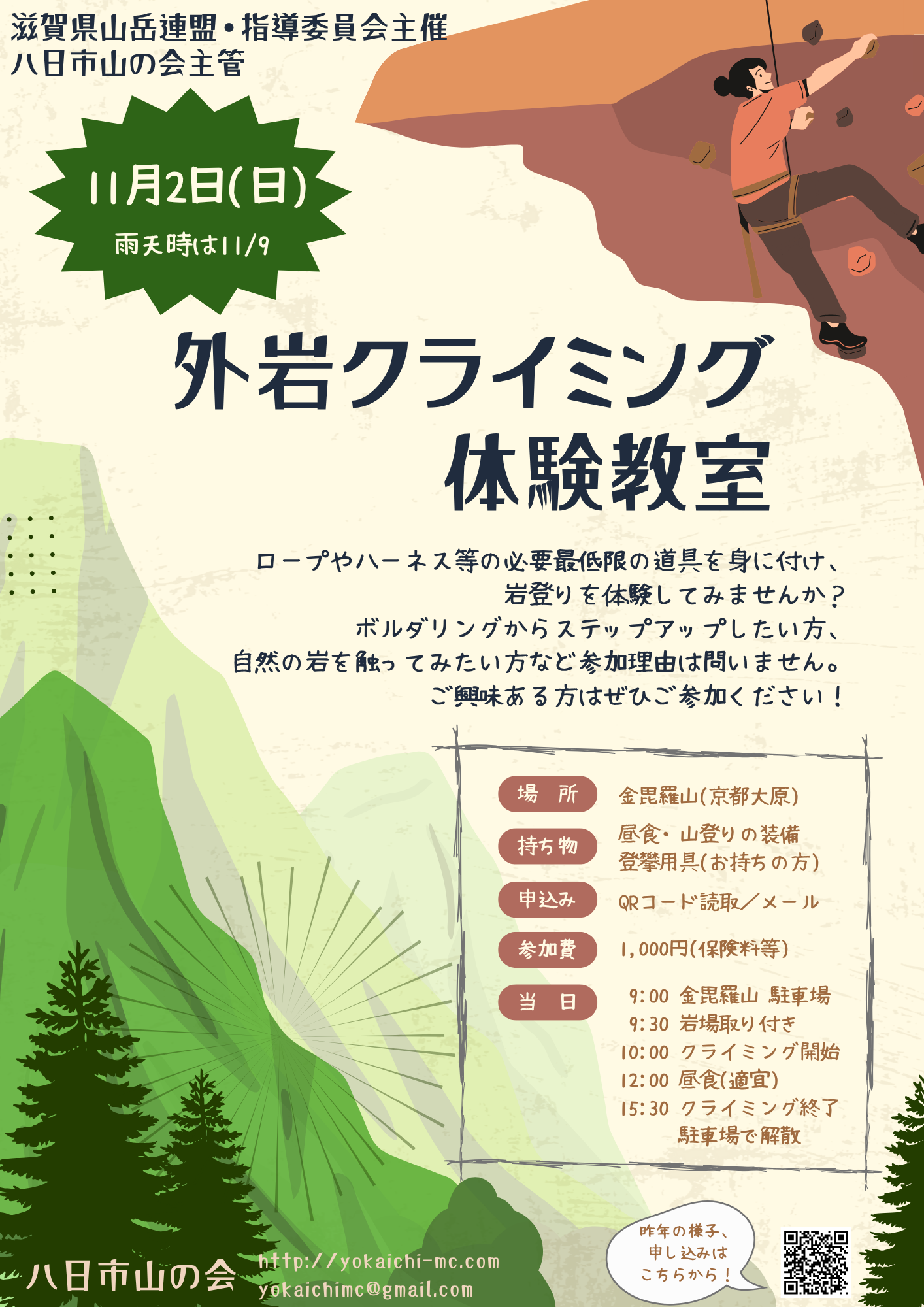 お知らせ 2025年度 外岩ロープクライミング体験教室の開催について Author admin Date 2025年7月20日 毎年八日市山の会にて実施しております、クライミング体験教室を今年度も実施いたします。 昨年度は一般・会員を合わせた15名で京都大原にある岩場 金毘羅にて実施、秋の気持ちのよい気温の中、天気も良く事故もなく、充実した1日と