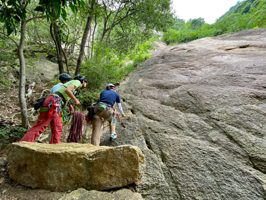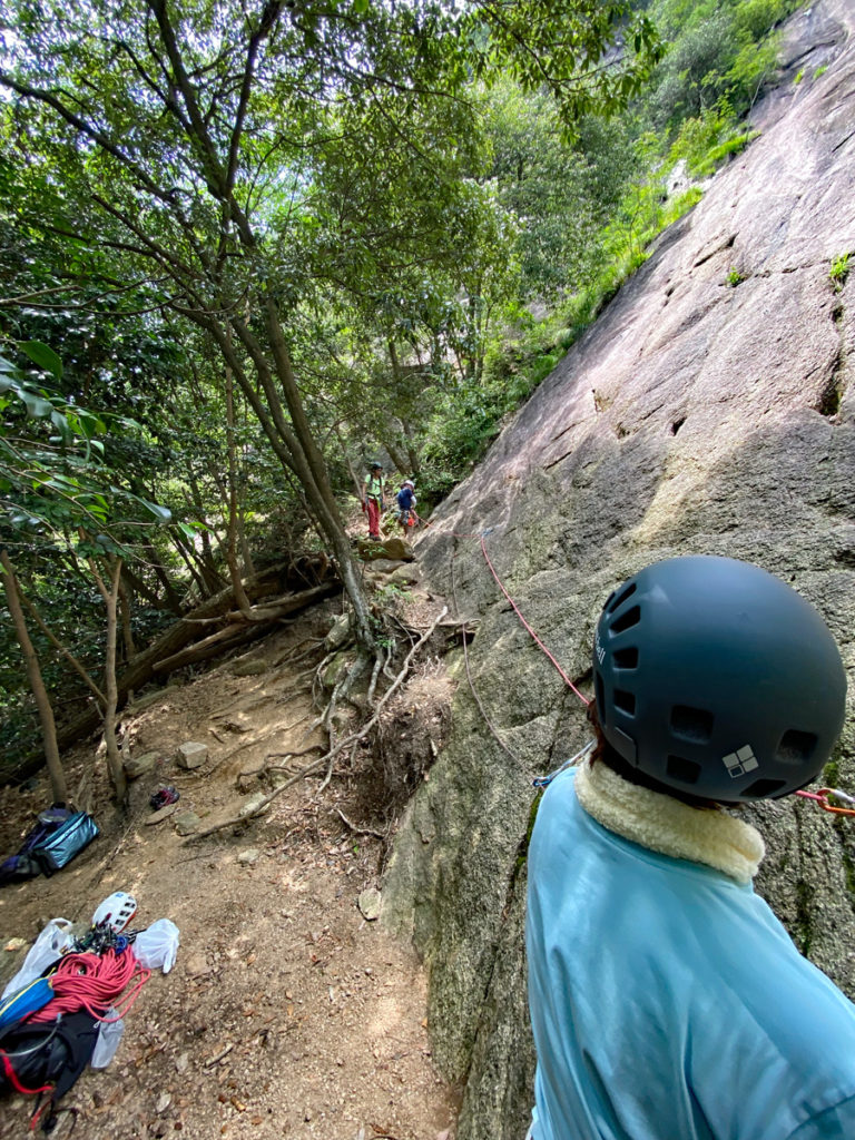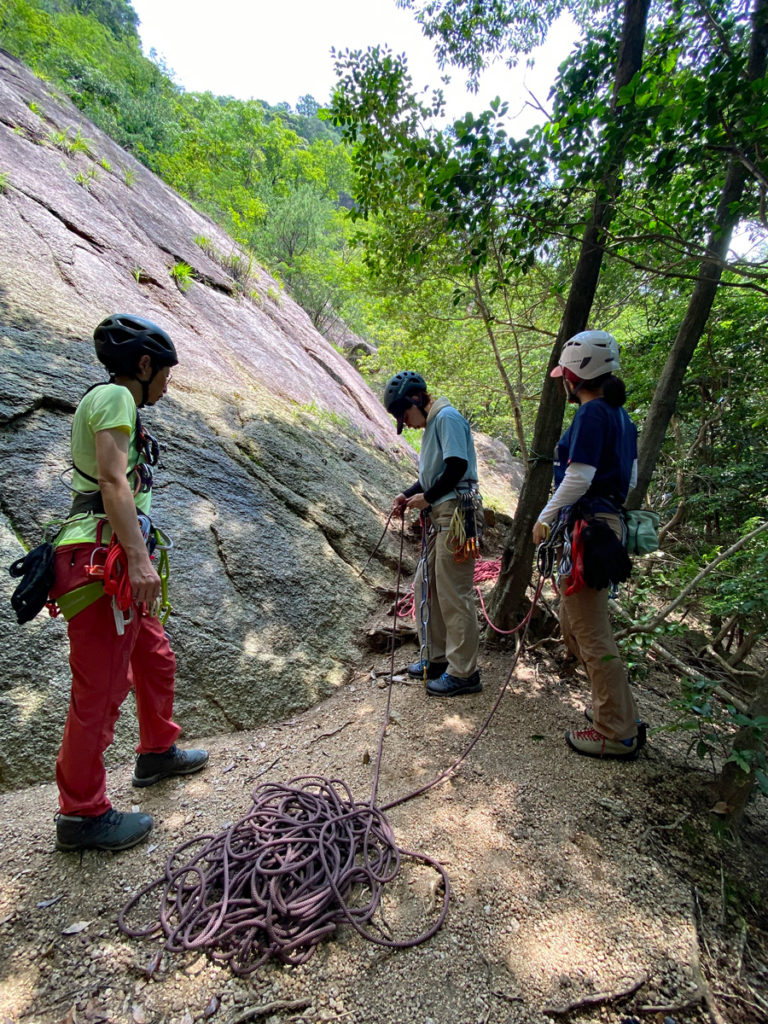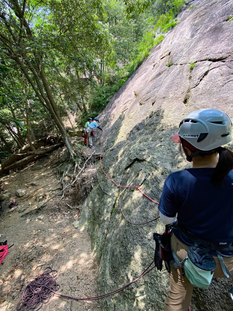 I関さんとO田さんがマルチピッチ練習初めてだったので、M戸とS根さんが2人を教えることとしました。岩場の取付でマルチの基本的な所作を説明し、2パーティに分かれて、M戸とS根さんが夫々リーダーで1ピッチを登った後、下の2人のフォロアーが各々登る。そこから懸垂下降で降りて全体の流れをつかんでもらいました。それらを何度か繰り返し、ピッチを徐々に増やしていこうと考えていましたが、岩場のあまりの暑さに熱中症の恐れがでてきたため断念。