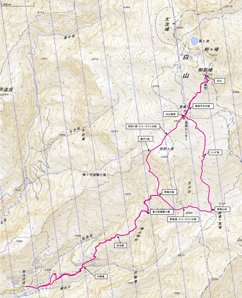 別当出合 6:10発 →中飯場 6:48着(小休止) → 別当覗 7:37着 → 甚之助避難小屋 8:15着(小休止) → 南竜分岐 8:51着 → 黒ボコ岩 9:50着 → 弥陀ヶ原・エコーライン分岐 10:03着 → 白山室堂 10:22着(小休止) → 室堂平北分岐 10:45着 → 白山 11:27着 (休憩) 11:34発 → 室堂平北分岐 12:06着 → 白山室堂 12:09着 (昼休憩) 12:46発 → トンビ岩 13:05着 → 南竜山荘 14:08着 (小休止) → 南竜道・エコーライン分岐 14:25着 → 南竜分岐 14:35着 → 甚之助避難小屋 14:52着(小休止) → 別当覗 15:26着 → 中飯場 15:58着 (小休止) → 別当出合 16:40着 下山