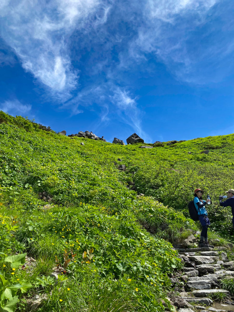 今年の白山は、残雪が例年より異常に多く、各施設で復旧遅れの影響があり、甚之助小屋では1箇所しかない冬期用トイレしか使えずトイレが大渋滞。トレイ待ちもあり時間ロスしました。白山室堂までは、昨年より15分遅れ程度で到着。白山室堂にある神社で安全登山を祈念させてもらい山頂へ向かいました。クロユリが沢山群生していてとても良かったです。