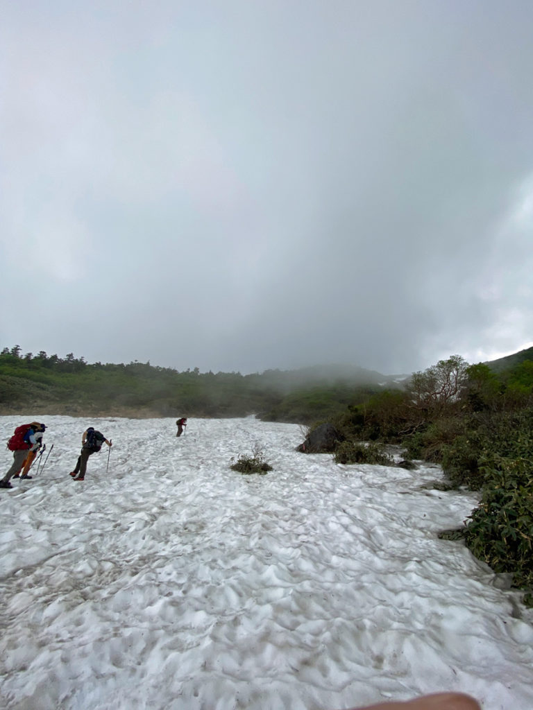 トンビ岩コースは、例年より雪渓の残雪がかなり多かったです。昨年より早い段階で12本爪アイゼンとピッケルを装着しました。その時に下から登ってくるパーティと出会いました。アイゼンを装備しておらず、登るのにかなり時間がかかっていたようでした。登るのはなんとかできるにせよ、下りは無理ですよとお伝えしてすれ違いました。その後で出会った登りのパーティは、私の話を聞いて、トンビ岩を登る事を断念し、恐らく砂防新道で登っていったと思います。雪渓に残雪が多く登山道がよくわからない状況なので、ルートファインディングをこまめにしながら降りて行きましたが、ここでアクシデント。残雪の薄いところに気づかずに左足を深く踏み抜いてしまい、右ひざ横を少し痛めたようでした。少し痛みはあるものの歩くには支障はなかったので、ペースは若干遅くなったものの、昨年より25分遅れで無事下山できました。