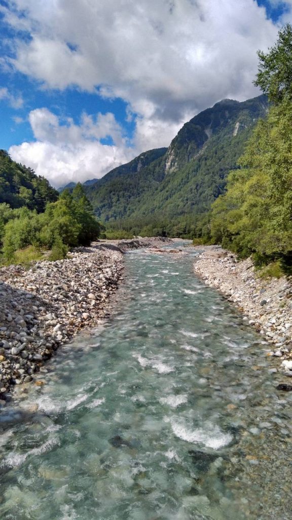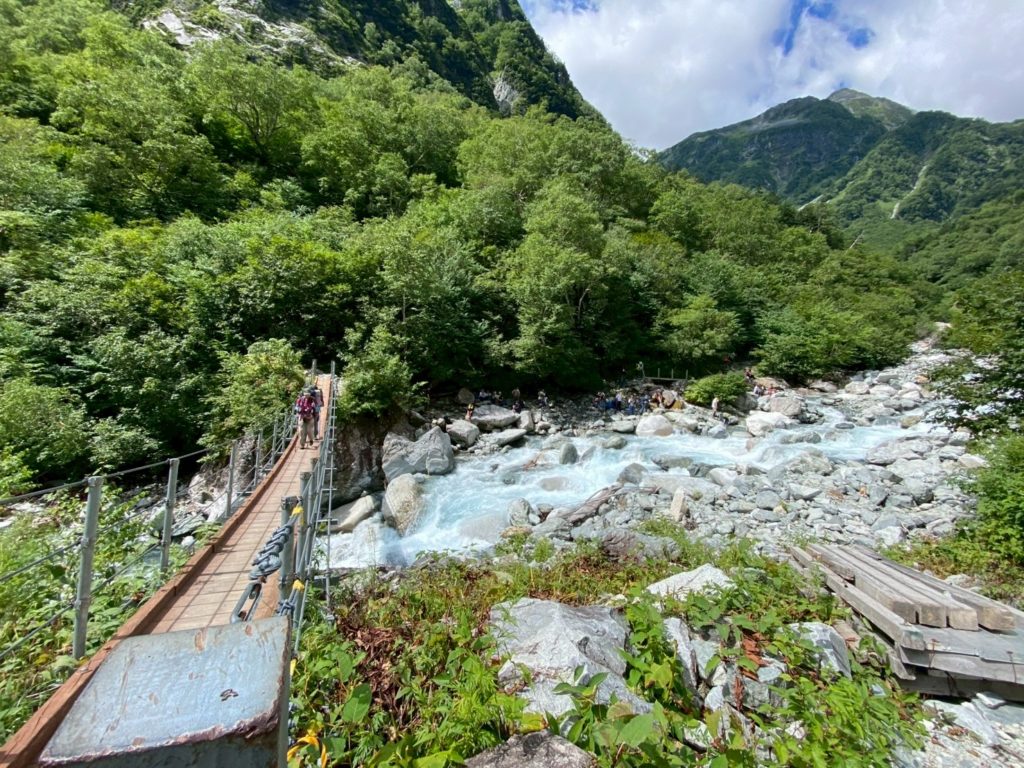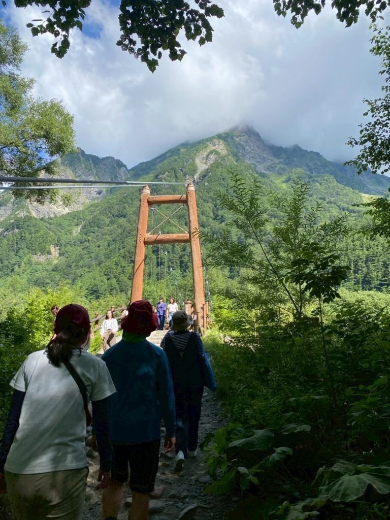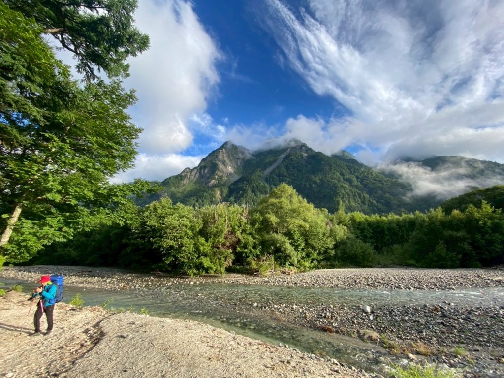 横尾 6:40発 → 徳澤園 7:46着(小休止) → 明神岳入口 9:05着 → 嘉門次小屋&穂高神社 9:12着(小休止) → 上高地ビジターセンター 10:12着(大休止/見学) → 上高地バスターミナル 11:00着 下山