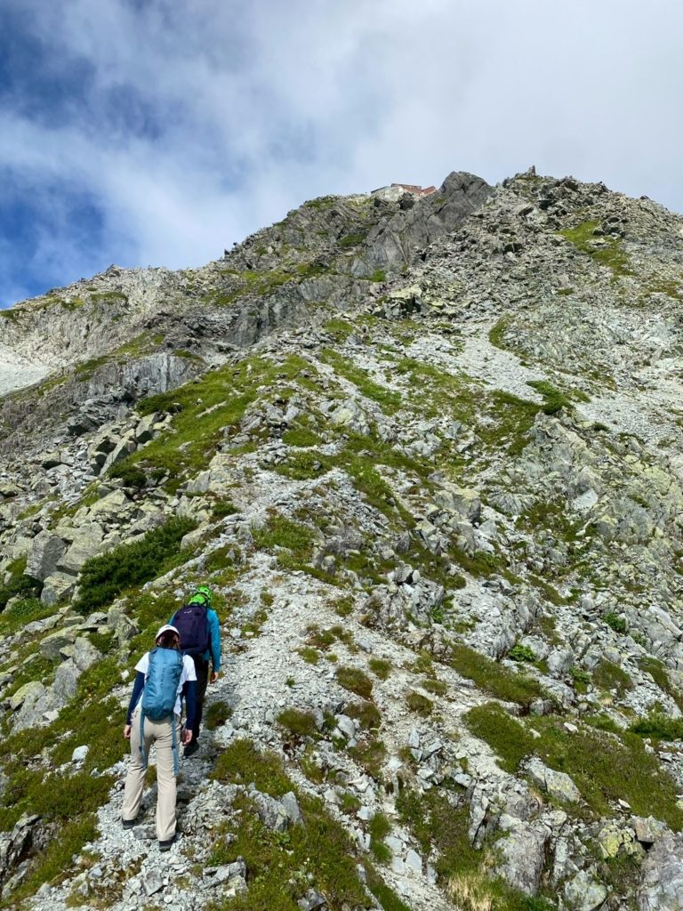 クライミング装備を外して、見えてる北穂高小屋を目指してルーファイ