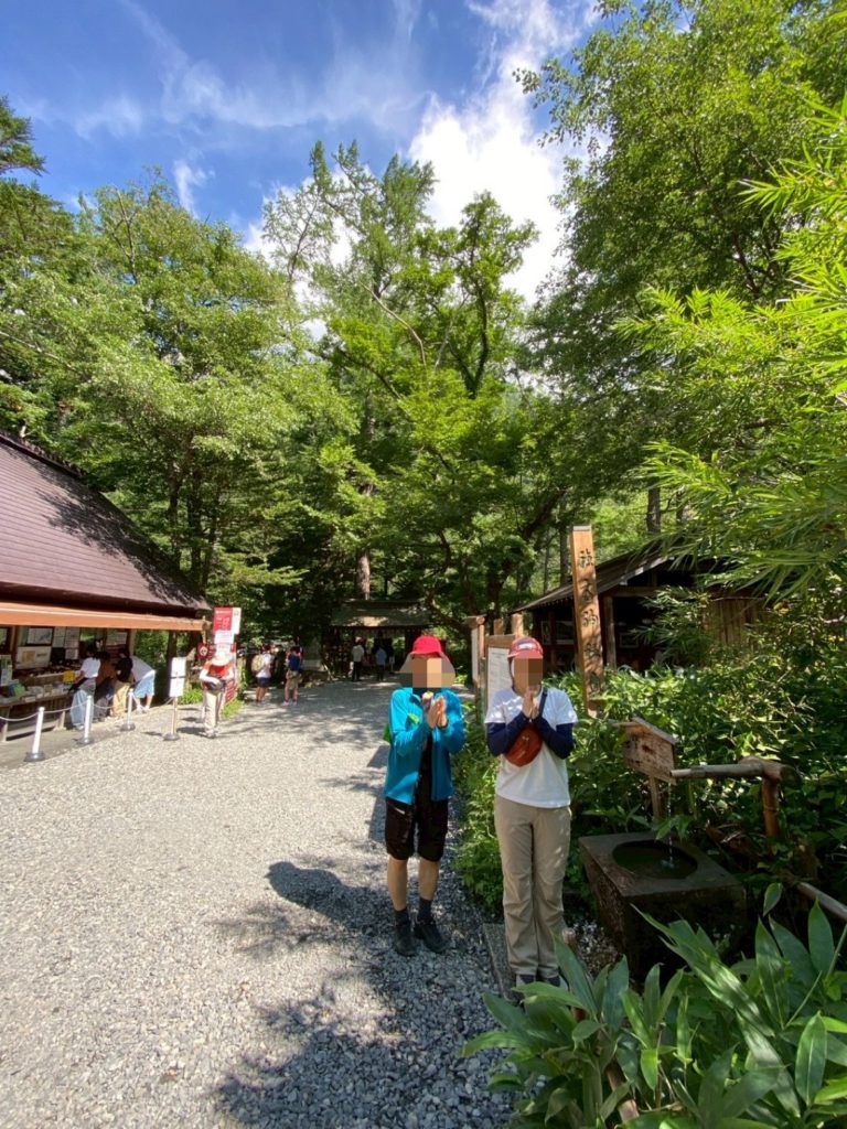 穂高神社でお賽銭をし手を合わせます