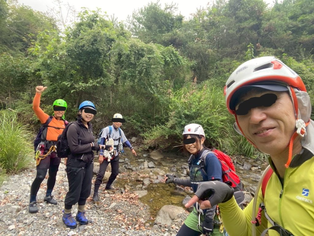 リーダーが右岸側のクラック沿いに登り、ビレーの準備をしてくれる。「筆者」滝をくぐり直登しようとするも、断念(なさけない)。全員登り切り第一喚問突破。