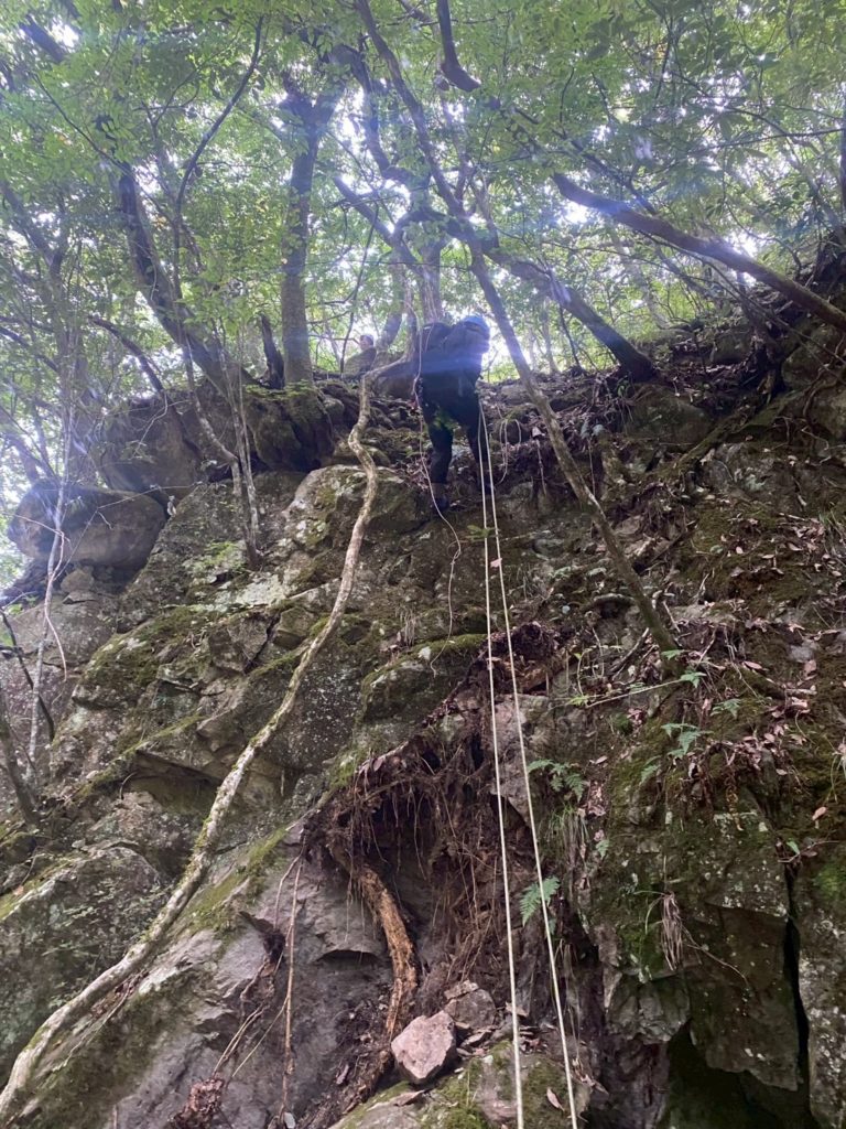 後半の難関に到着。ショルダーでリーダーに登ってもらい、ロープ出してもらった後、アブミとショルダー併用で全員登りきる。