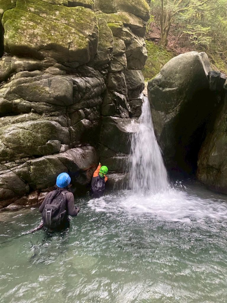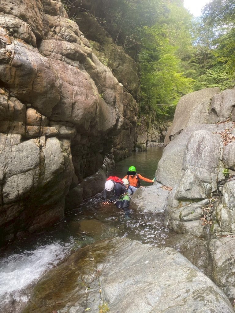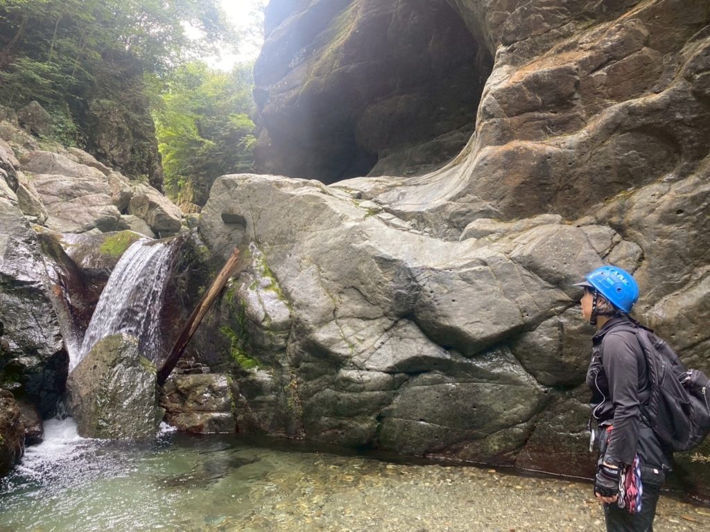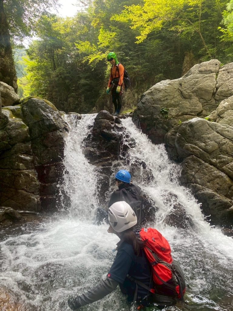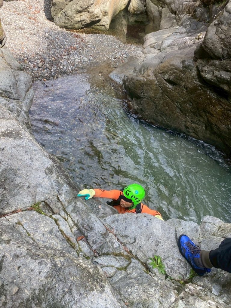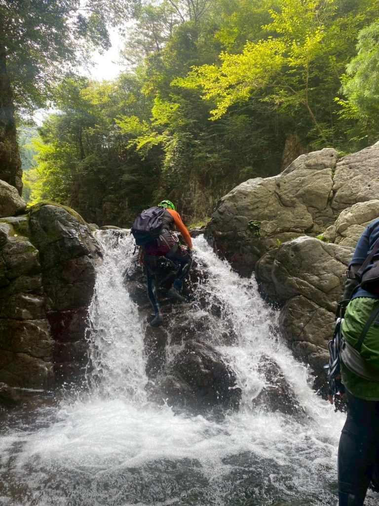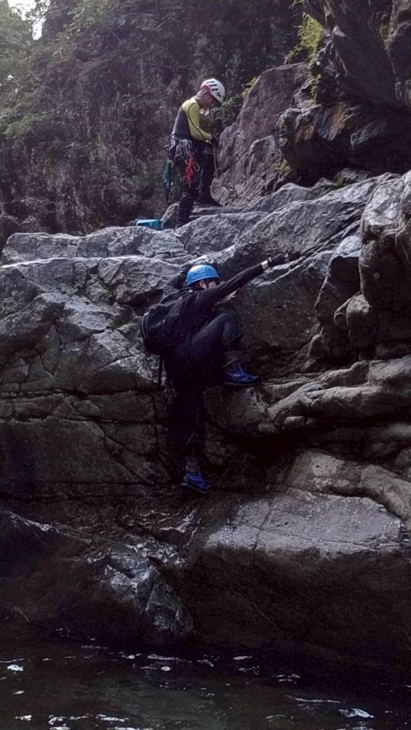 ちょっとムズイ岩を登る。川底に岩があり落下すると危険な場所だ。