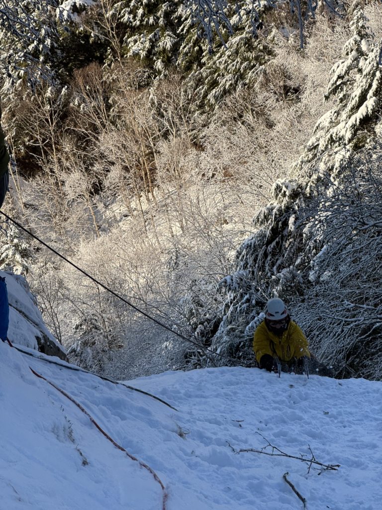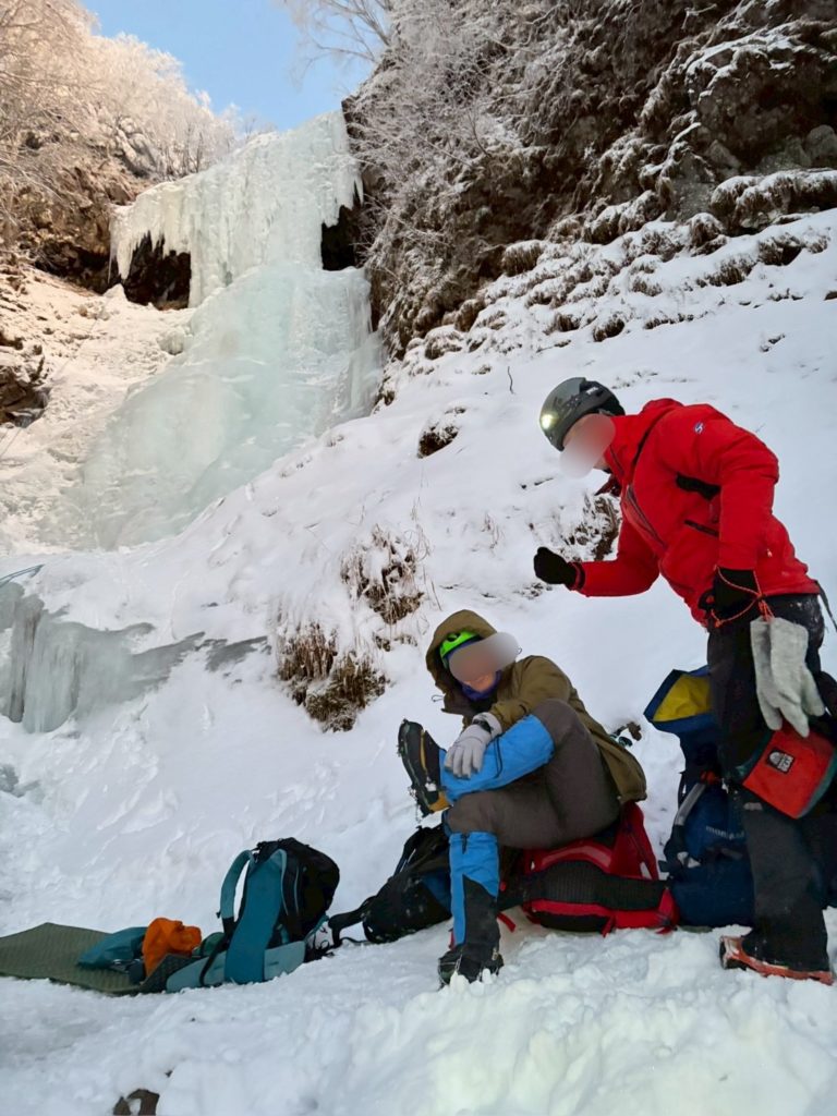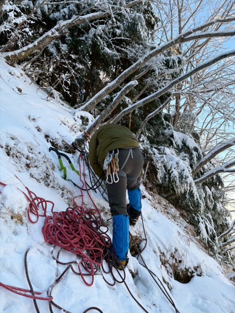 登攀後、ロープを繋ぎ懸垂下降しましたが支点が微妙で若干気持ち悪かったです。バックアップ懸垂が覚えていたのに怪しい挙動を取ってしまったのでこれも要練習です。後、足を置いたツララが割れて膝をぶつけました。