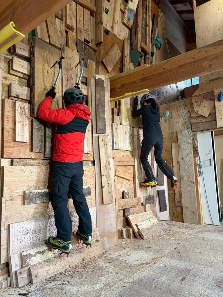 午後からは人口氷壁での練習。残念ながら未完成だったため、下部でアイゼンワークとアックスの打ち込み練習をしました。今回教えていただいた歩き方は通常の雪山でも生かせるもので、アイスクライミングを習いに行ったのに得した気分になりました。なおアックス打ちはイマイチでした。要練習です。