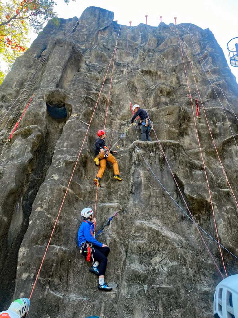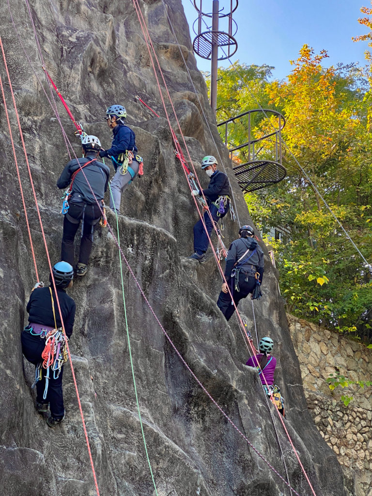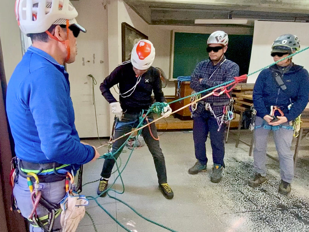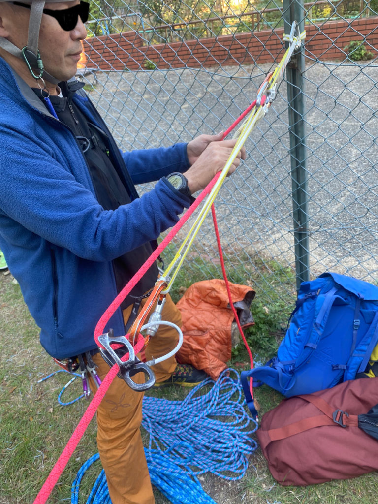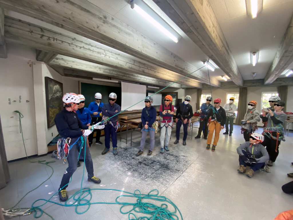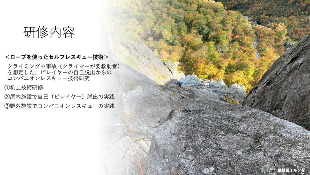 今回のテーマは、今年度は山岳遭難事故が過去最多という背景もあり、クライミング中の墜落事故によるセルフレスキューで、現実的に行われるであろうコンパニオンレスキューを主テーマとしました。