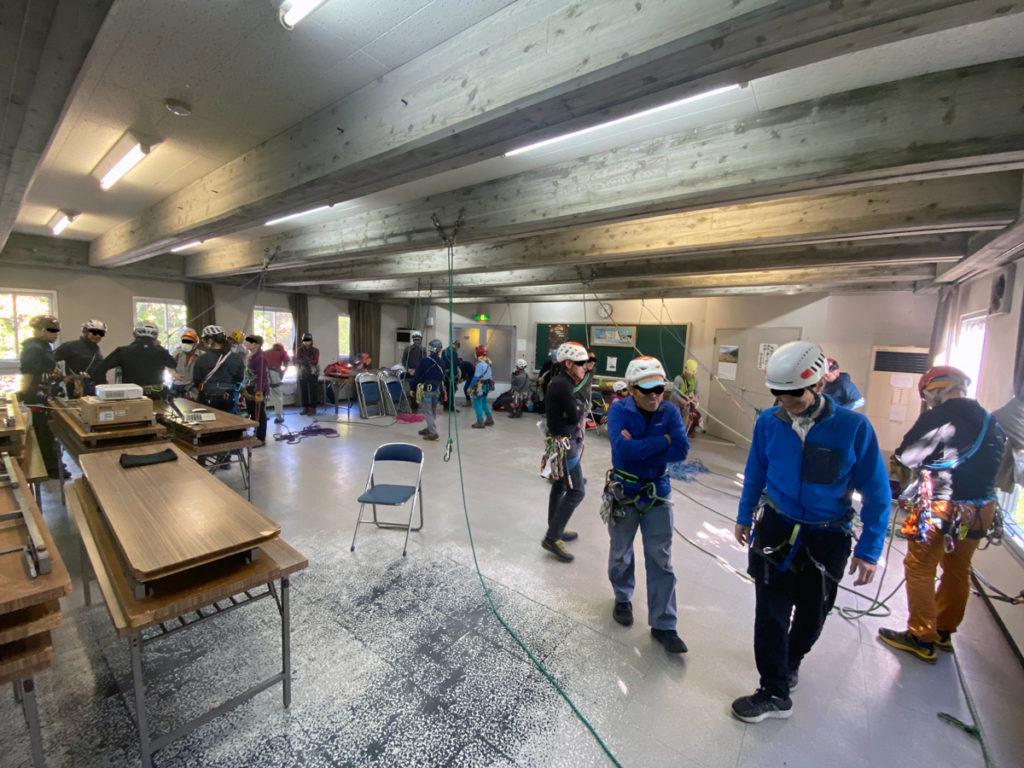 今回主管担当となったM戸の心配をよそに、28名とかなり多い参加人数となりました。近畿地区山岳連盟だけでなく労山からの参加もあり、クライミング中のセルフレスキューへの関心の高さがうかがえました。会場の切り盛りは大変でしたが、机上講習だけでなく実践研修でも意見交換が活発に行われて大いに盛り上がった研修会となりとても良かったです。悔やまれるのは、M戸は終始運営側として走り回っていたので、研修中に実践することが全くできなかったことです(T-T)