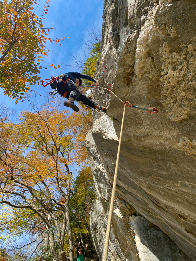 その後は、M尾さんが最近何度も通ってチャレンジしているハイカラサン(5.12a)をビレイ。何度かテンション掛けながら徐々に登り方を探って解決していき、最終的にはRPしました。さすがですね!