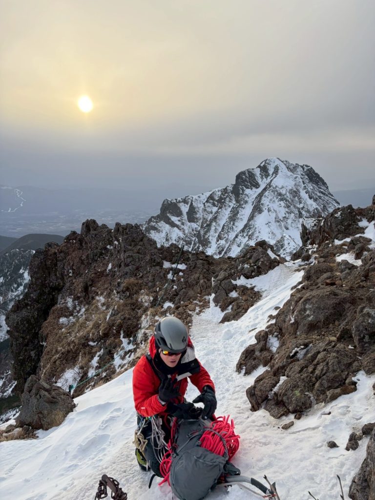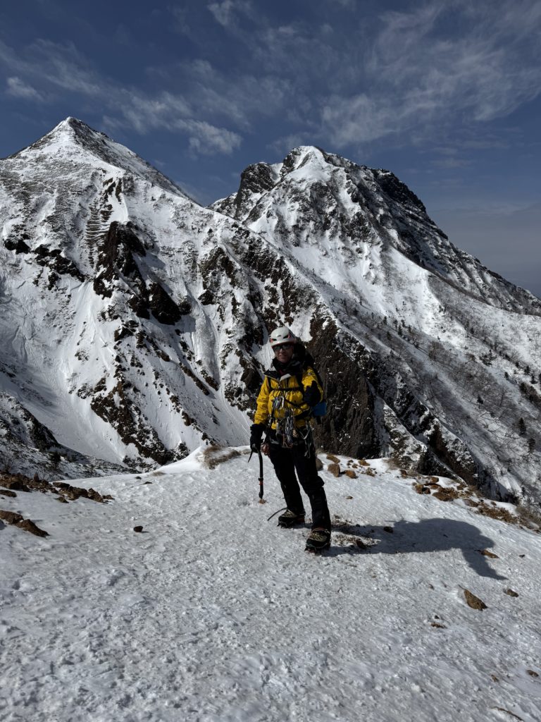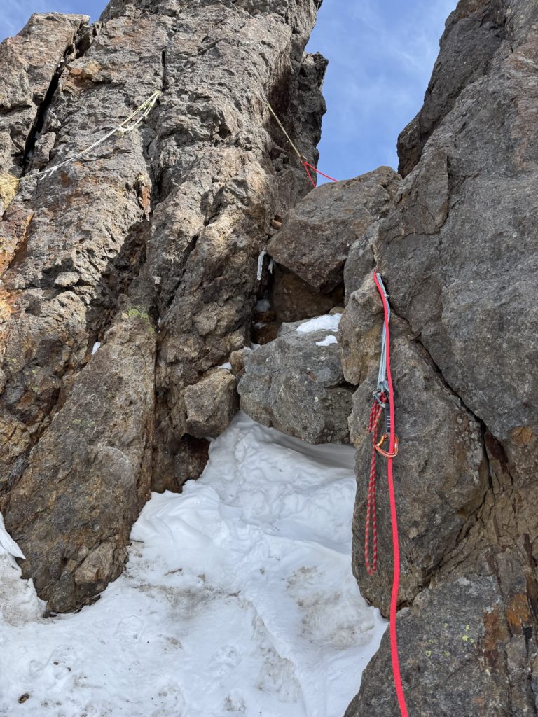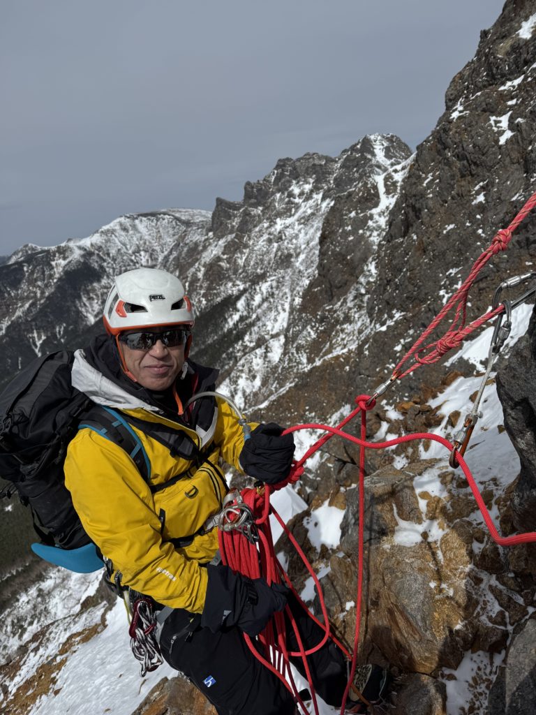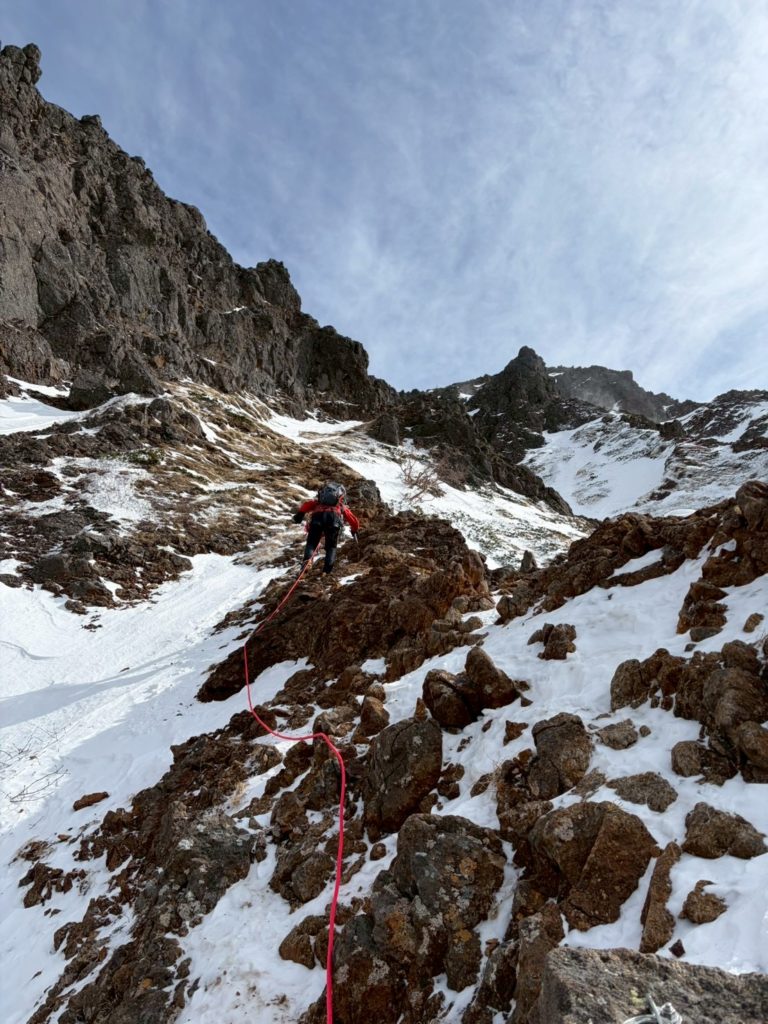赤岳主稜で1番難しいとされるのが1P目のチョックストーン越えなのですが、確かに出づらくロープ無しだと自分には無理だと感じました。雪が少なくルート全体を通して登りづらかったです。