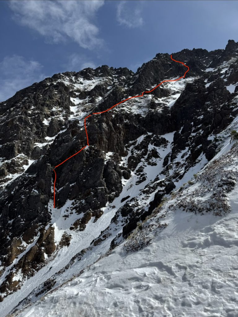 取り付き地点より。今回登ったルートをなぞってみました。赤線の裏側を通っている場所もあります。