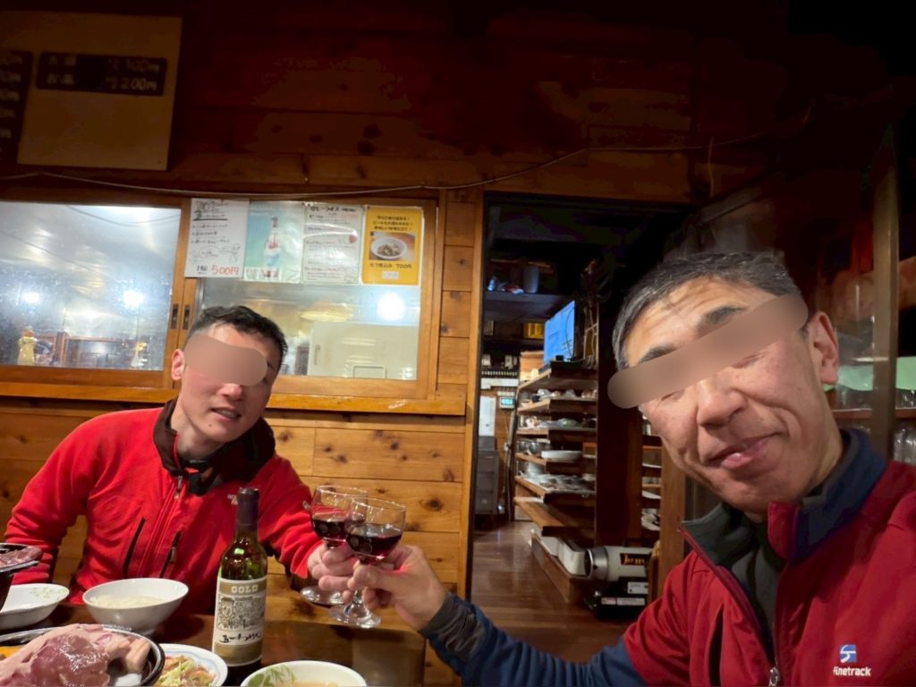 赤い二人、無事登頂出来た事を祝い、赤ワインで乾杯。