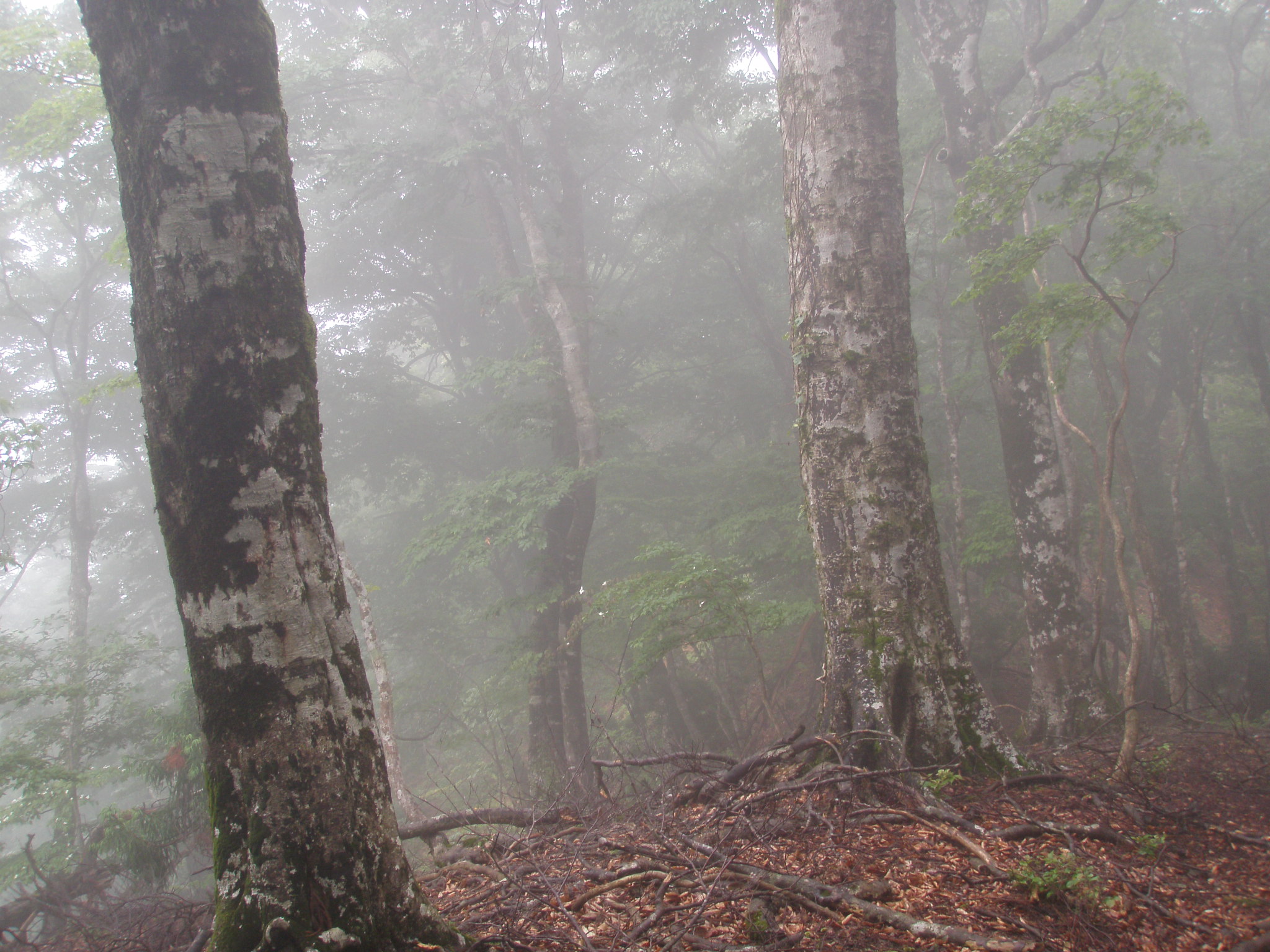 シンコボに到着して昼食していたら、再び雨が降り出し、食事もそこそこに片付けます。歩き出したら雨はやみます。今日の天気は意地悪です。参加者は半減にするし、出足はくじくし、昼食もまともにさせてもらえません。ガスが掛かり神秘的です。