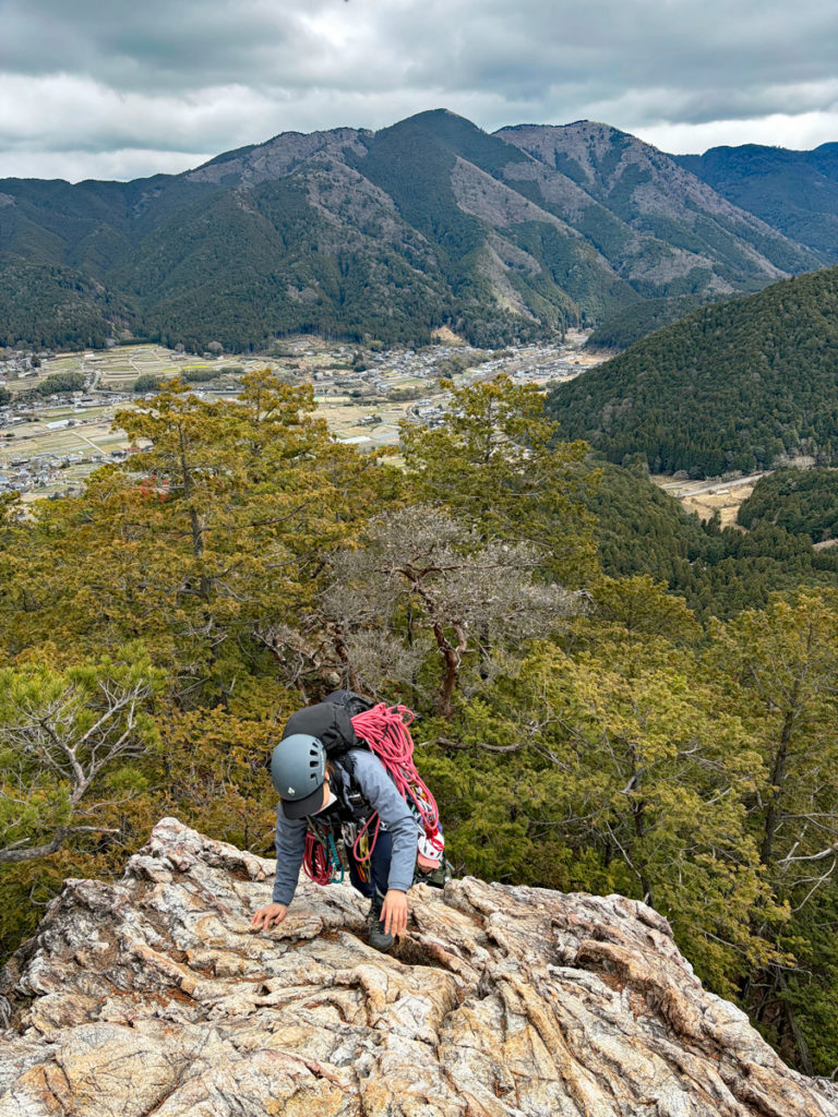 まず北尾根の取付でカムの操作を説明し練習をしてもらった上で、最初は、M戸が手本で全ピッチをリードしました。その後で各々リードし合計3往復する予定でしたが、想定以上の低温と強風による寒さで、皆がブルブル震え上がり体調が最悪な自体に、、、(T-T)ということで、M戸の手本のみでクライミングは終了〜笑