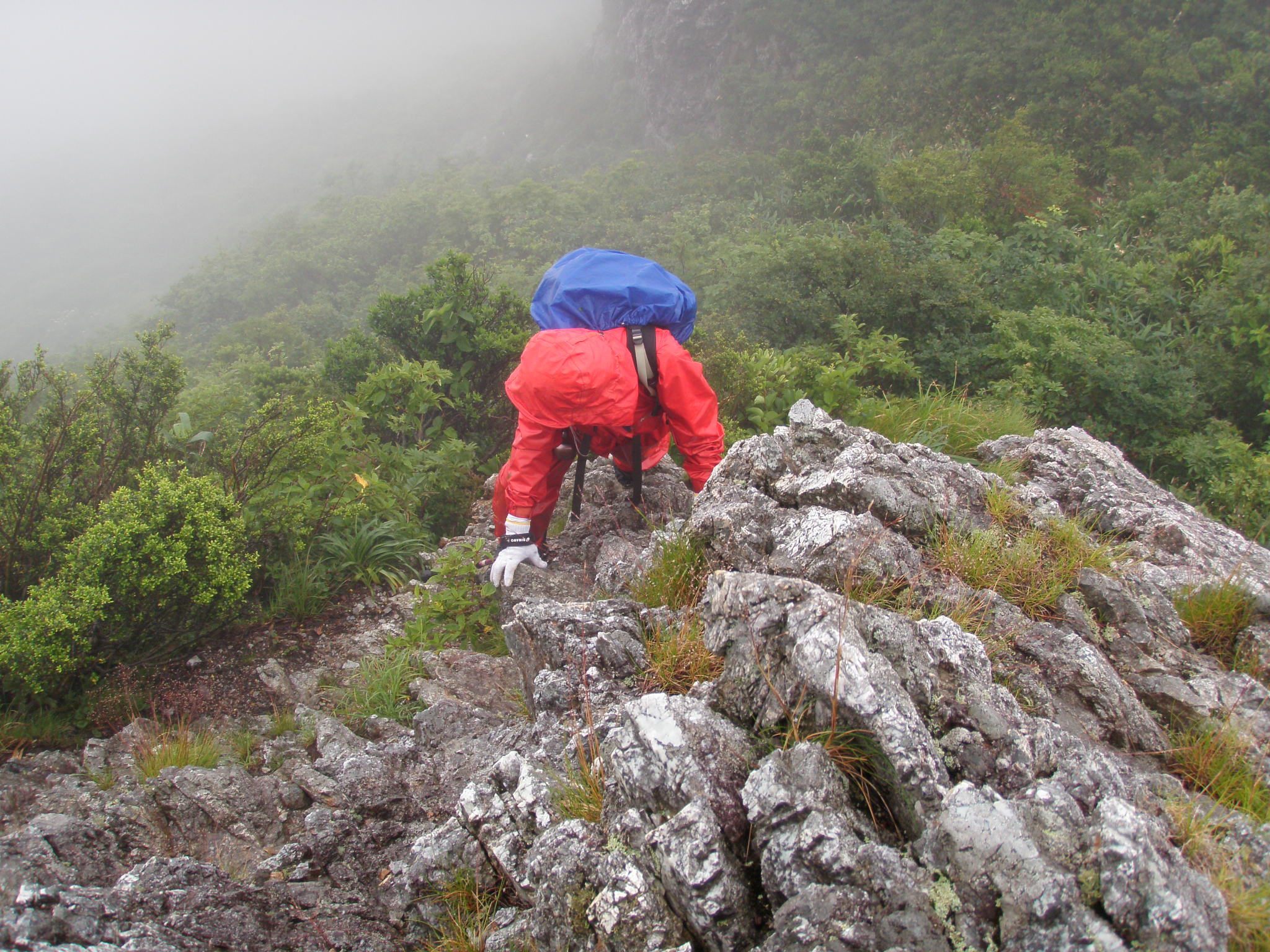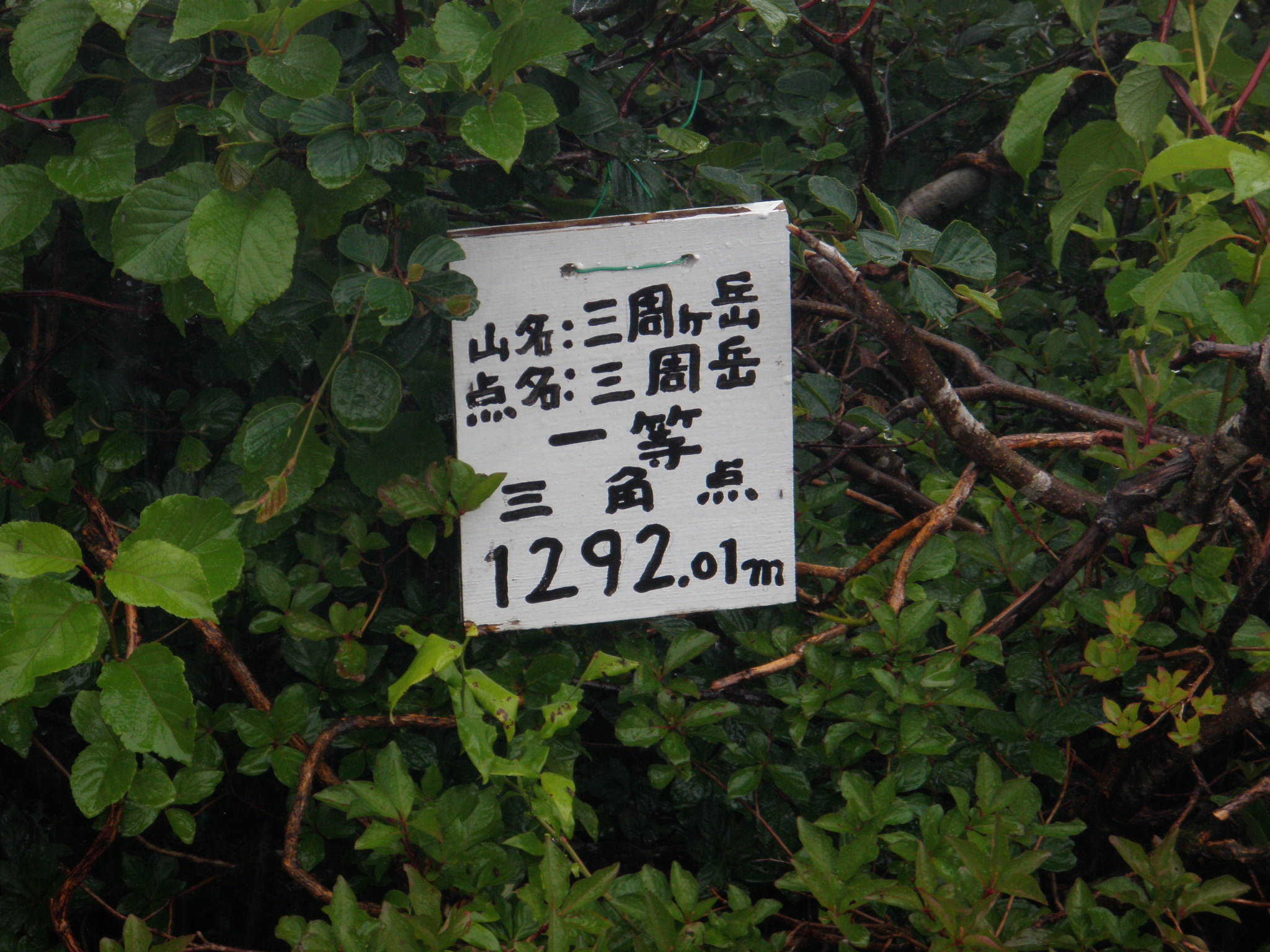 やっとの思いで三周ヶ岳に到着ですが、雨は降っているし、風もあるし、何より寒いので、軽く食べて引き返します。この稜線にはササユリが多く咲いていました。又此処の山頂は一等三角点です。