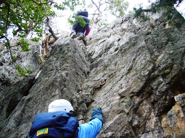 懸垂の練習後、残り時間でフリーをゴリオシ。行ったことのない、Mフェイスの岩場へ向うことに。下る途中少し道を外したが、無事岩場へ到着。右側は上部までマルチピッチもでき、ビレイポイントも開けていて快適な場所。 Mクラック10aオンサイトだ!と意気込んでトライしたものの2ピン目からなかなか進めない、何回かテンションもらい結局HDして一旦終了点まで行くことにした。その後、O畑さんがTPでクリア。傍から見るとムーブが参考になる。ここでニューシューズ(5.10ジェット7)に履き替え再トライ。今度は3ピン目取れて行けると思った途端スタンスが甘く落ちてしまった。上部は問題なくこなせたがワンテンが悔しい。