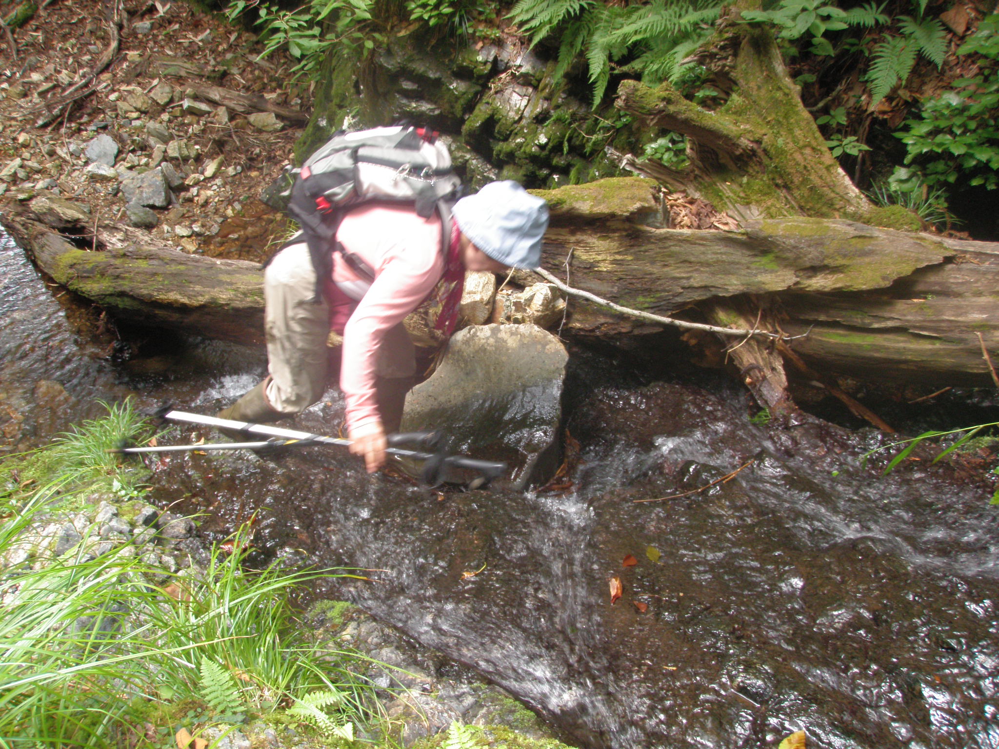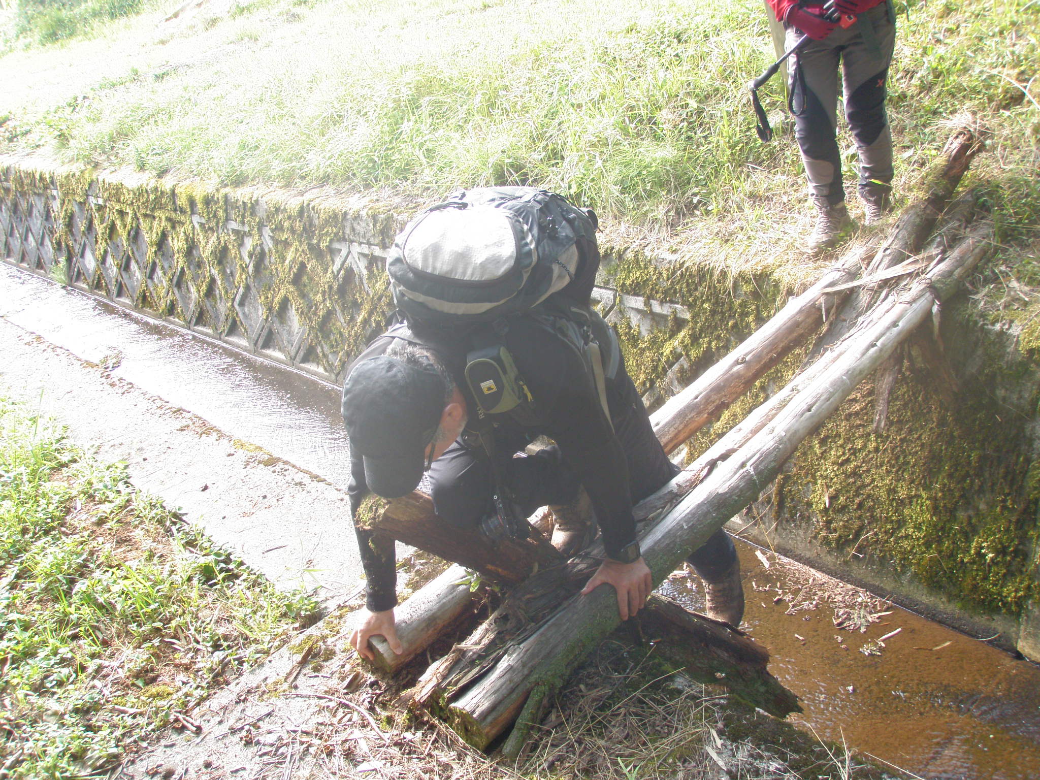 尾根末端に取り付く為に丸太橋をモンドが渡り、二番手のバラ氏が渡ろうとしたら、丸太橋の真ん中が腐っていて足が嵌りました。やはり橋は端を渡りましょう。