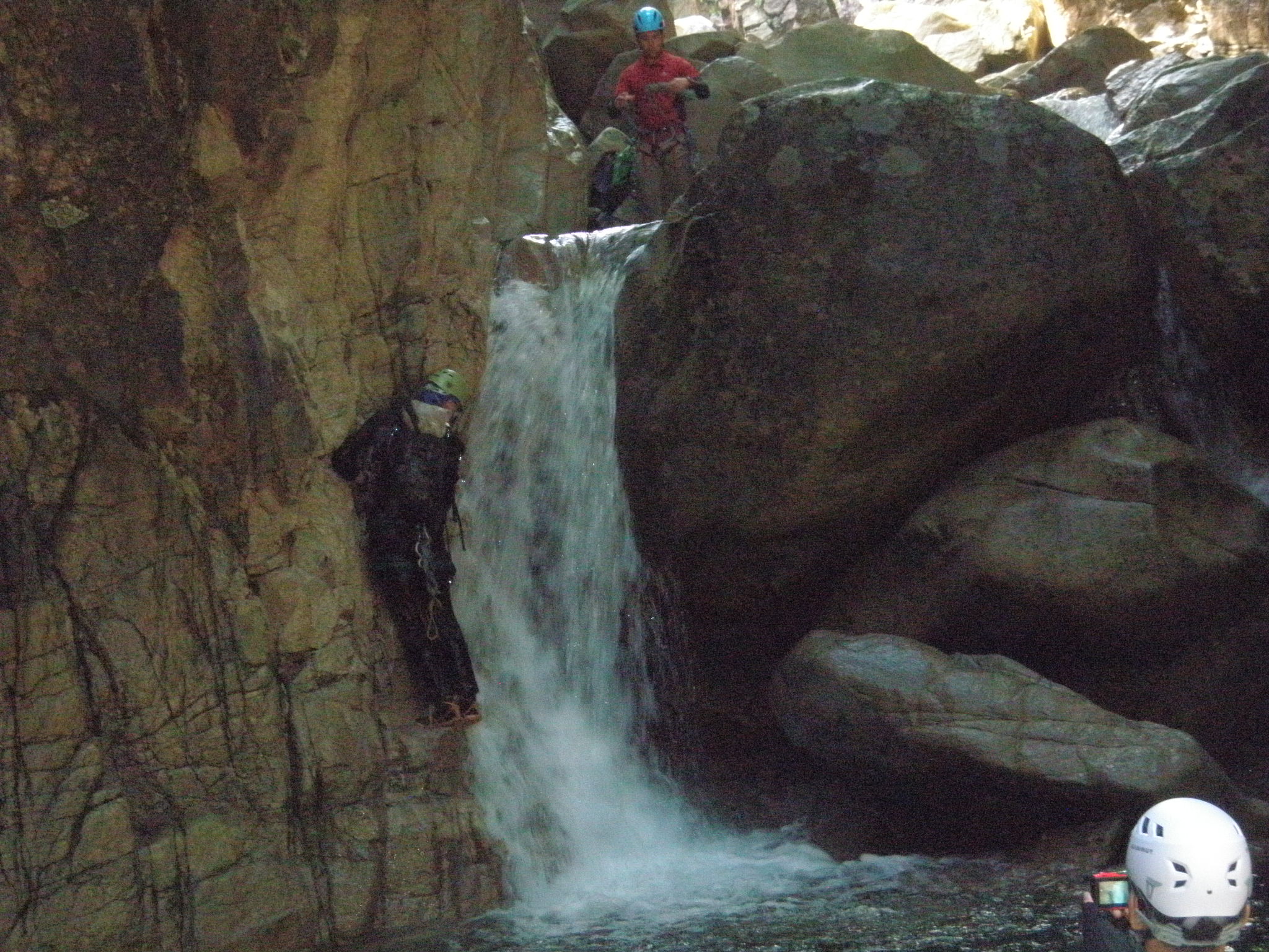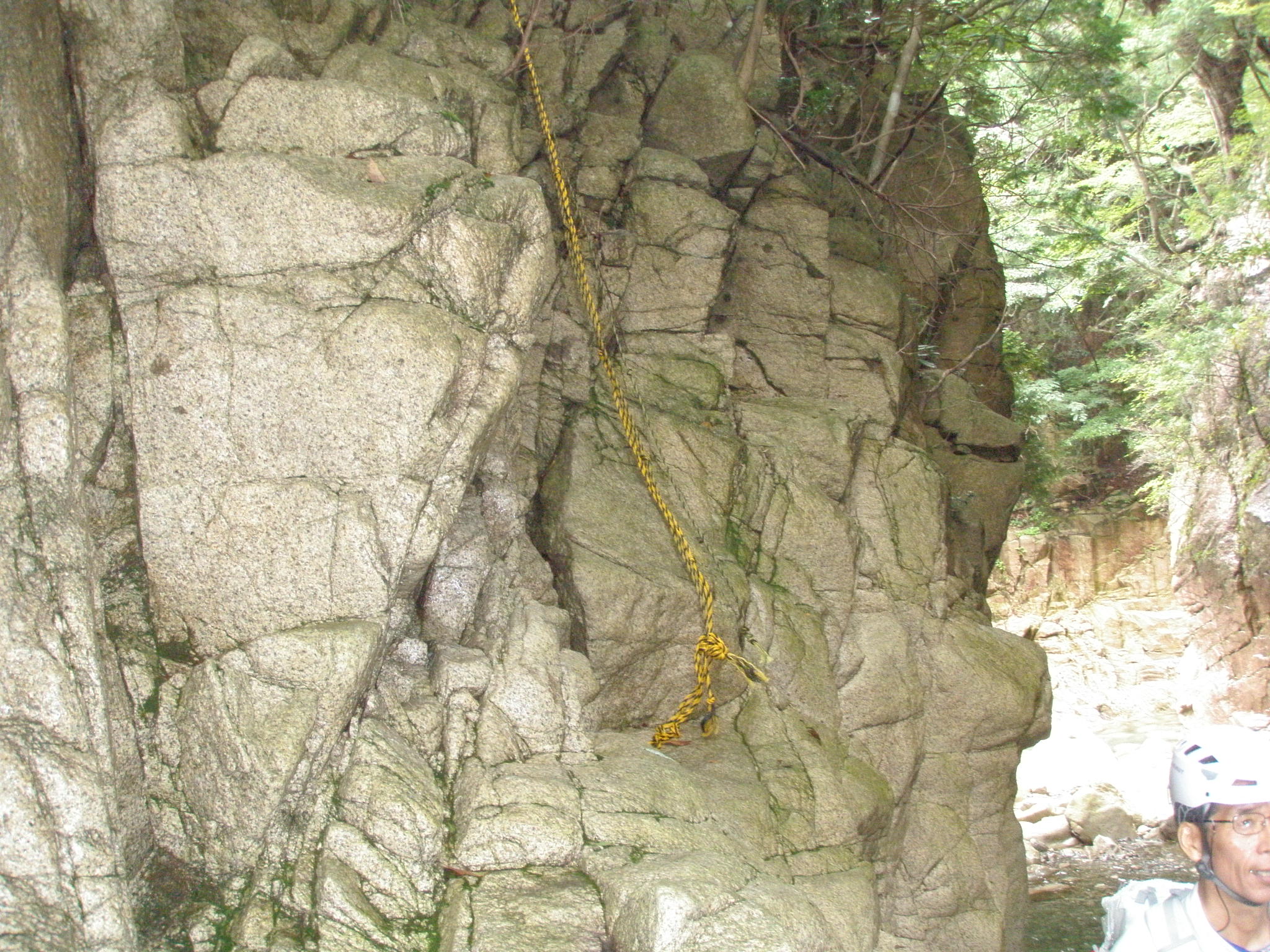 いよいよ左岸側に有る、残置の虎ロープが有る、滝の巻道です。若い二人は滝の直登に挑戦です。すぐにあきらめて此方に来ると思って居ました。まず最初にモンドが30メートルザイルを付けて登ります。此処で立木で自己ビレイして後続を引き上げます。一度テンションが掛かりましたので、落ちて死んだのでしょう。そんなことはありません。想定範囲内でしたので、今日は2本のザイルを持参して要所ではザイル確保しているのです。