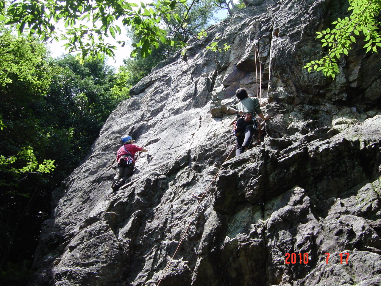 7/17金毘羅 Author ymc Date 2010年7月18日 Comments: Leave a comment 今年の梅雨はよく降りましたね。休みのたびに雨で練習できませんでした。やっと梅雨明け。満を持して?金毘羅に行ってきました。F谷、T中秀、O野、OY田、別行動でH山、M田。ロープワークを練習すべく、ダブルロープで数を登ることにしました。ゲートロック、チムニー、MKとつないで10本登りました。暑かった。疲れました。写真はチムニー、右の人は別パーティー。