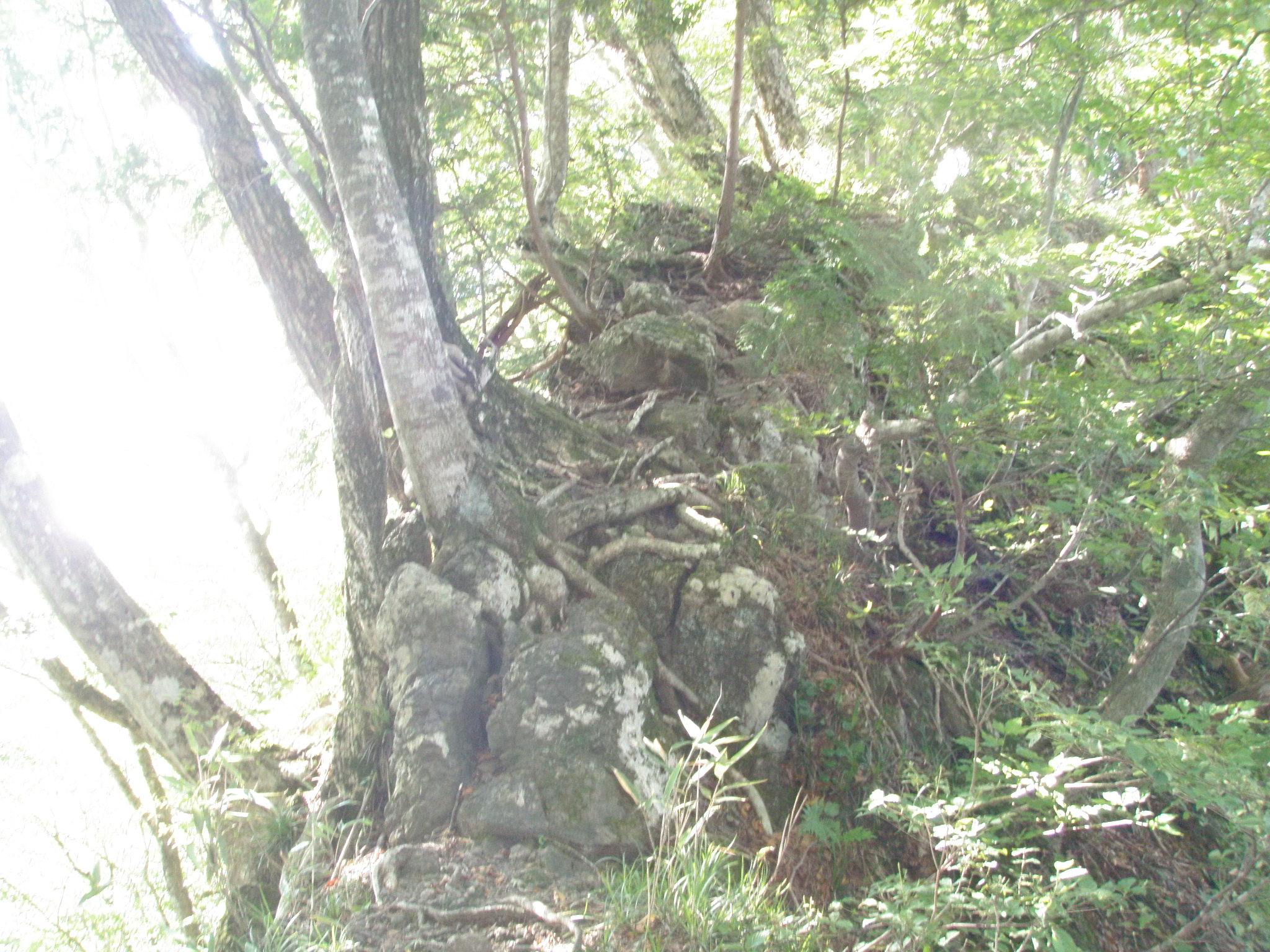 他にも切り立った細い尾根で、土が無くなり空中遊泳みたいに木の根や枝に掴まりながら、通過する所もあります。それでも花房山登山口には17時到着予定が16時38分に到着しました。出発が19分早かったので、計画より3分早い到着でした。初めて歩いた縦走路ですので、3分違いは良い計画でした。何しろ10時間に及ぶ山行ですので、綿密な山行計画が必要です。