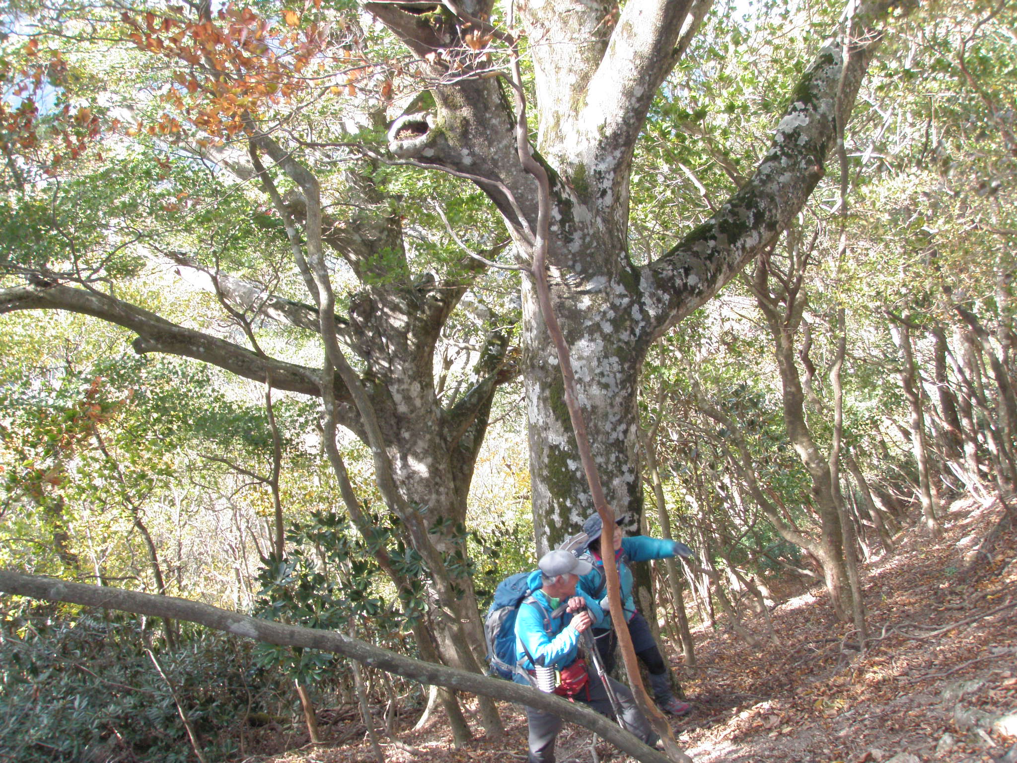 後半は県境稜線を歩き烏帽子岳に向かいます。アップダウンが激しく、尾根も細く。両側の谷は切れ落ちていて、岩場も出て来て、気の抜けない県境稜線でした。途中に大ブナが2本ありました。
