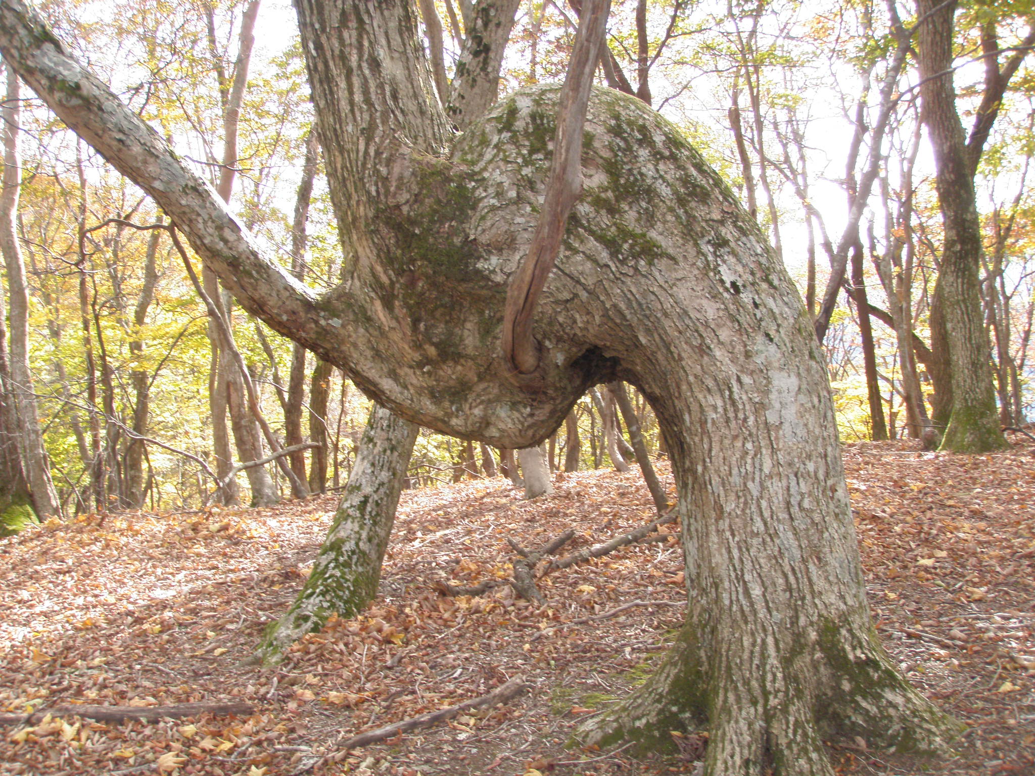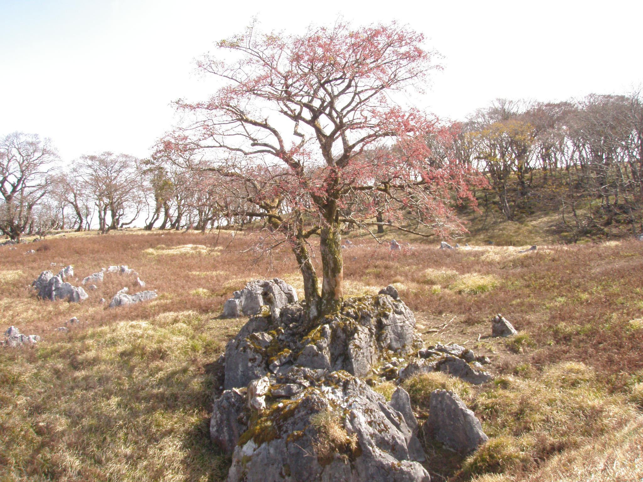 テーブルランドへの登りはトラバースから北の支尾根に出て登りました。少し休憩したら、直接東のボタンブチに向かいますが、途中には根性マユミが有ります。なんと岩に根付いているのです。