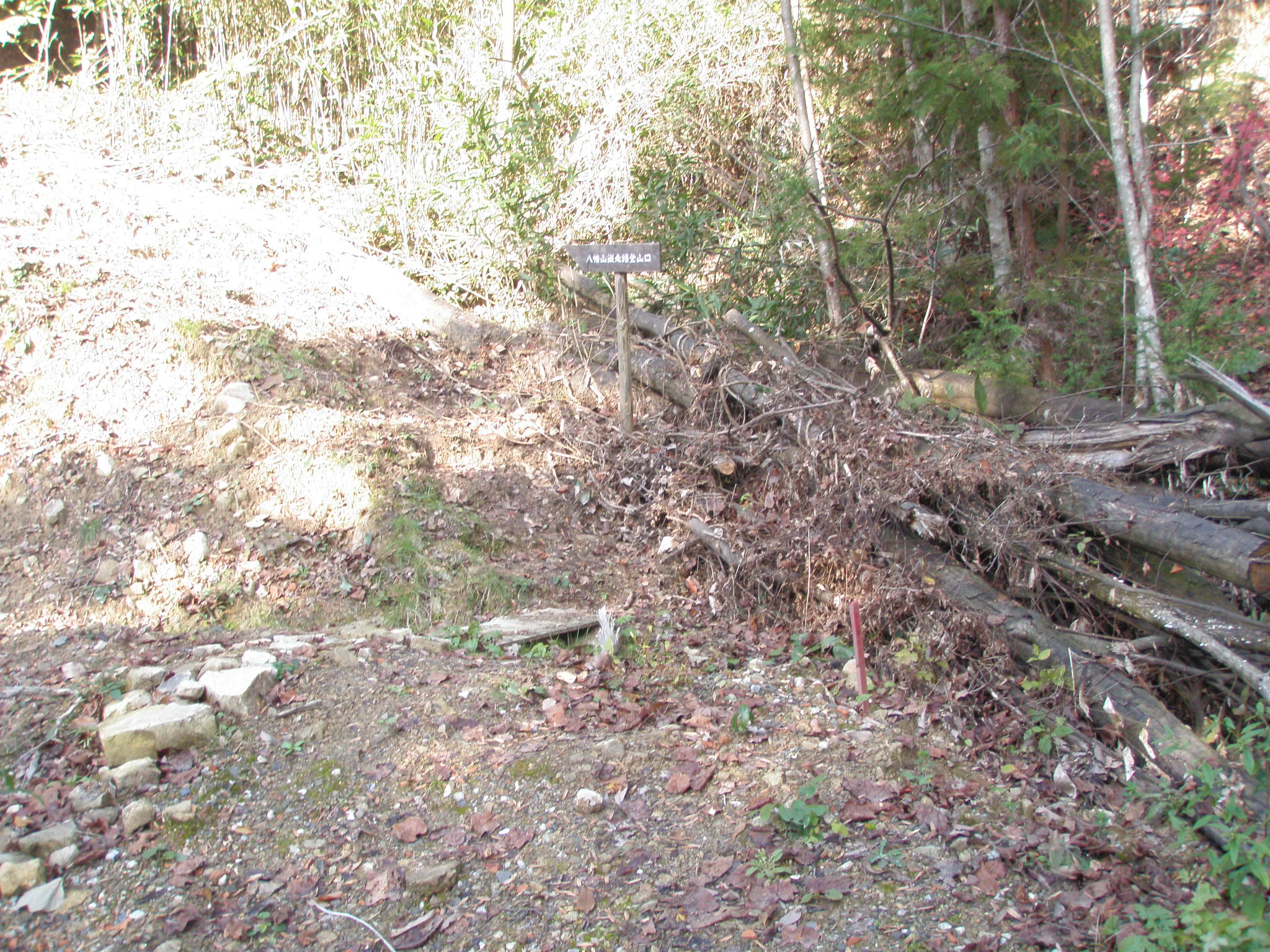 右に登山道が有ります。2回目の時は右に注意を払いながら歩いて見つけました。踏み跡がありますのでわかった次第です。今日は注意深く見ましたが、道標は無く、木にテープが巻いてあるのが一つ見つかりました。
