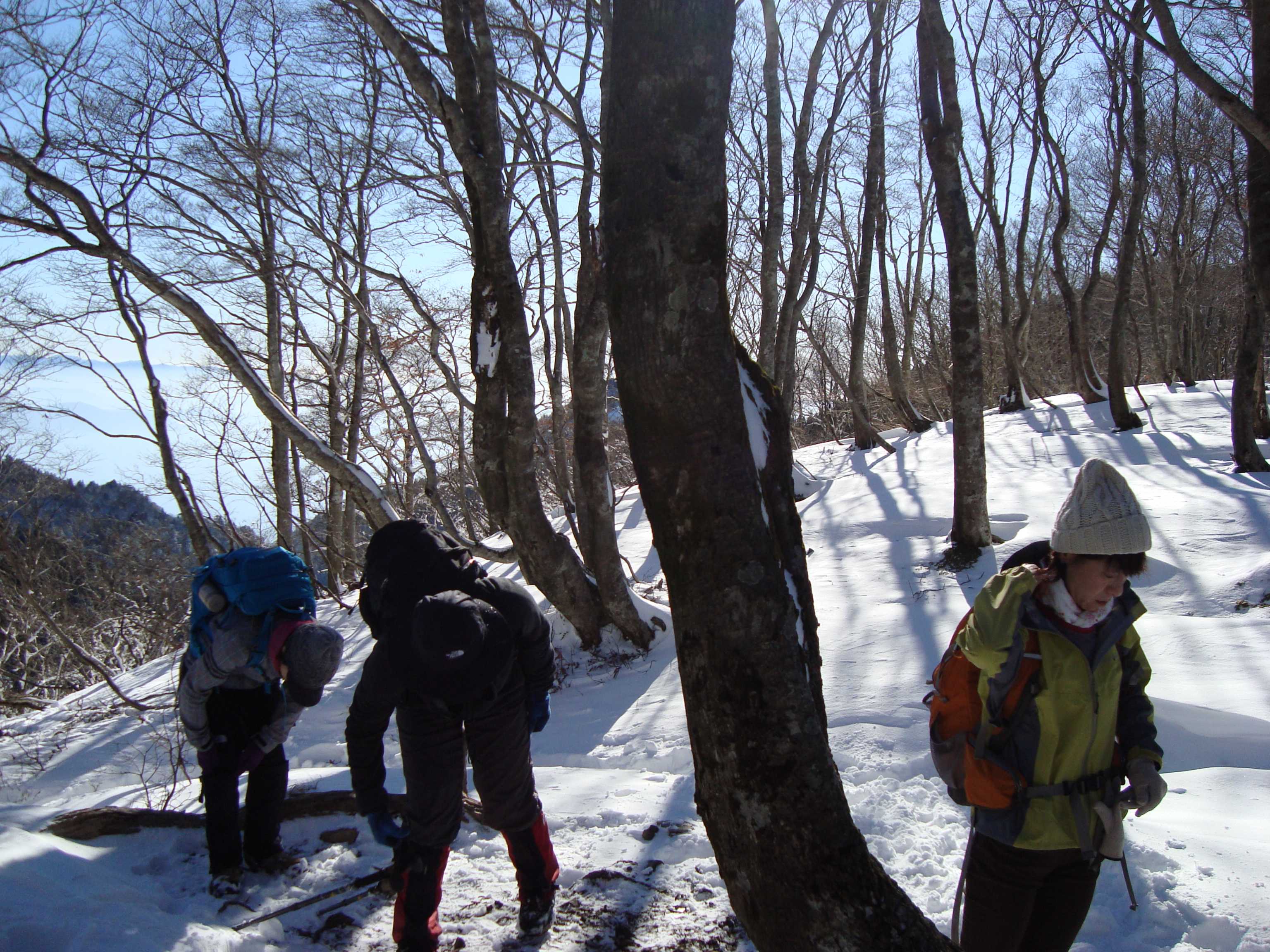 昨日の寒波で、比良稜線は雪化粧、積雪が如何程か心配しましたが、多い所で20~30cmでした。雪山歩きが初めての二人は、雪道を歩く感触を楽しんでいた様でした。当日は、天気が良く県内の山々は勿論、白山や御岳が良く見えました。(記:F川)