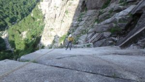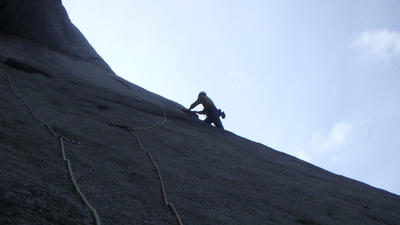 一の壁の最後は5ルートをリードで。易しくはないが快適なクライミング。最後の支点から脆い岩質をのっこした所が本来の終了点と気づかず右へトラバースした終了点へ。そこでも間違いではないとのことですがちょっと悔やまれる。