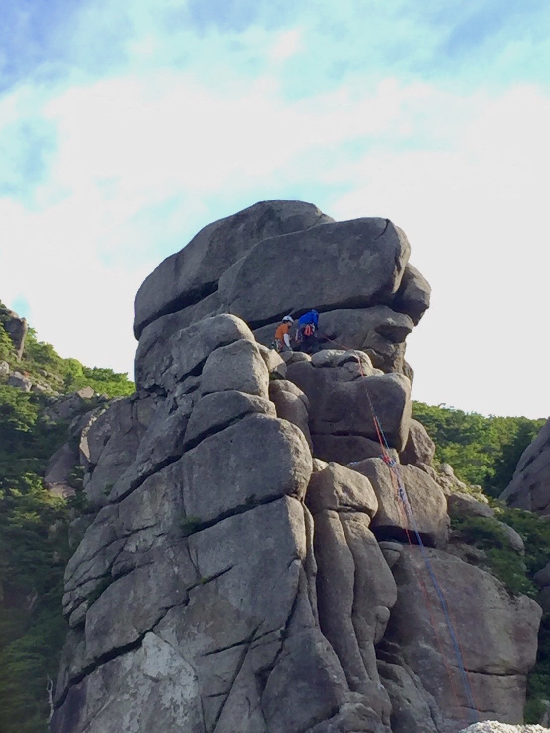 P2 ヤグラ登攀後に懸垂下降の準備をしているM戸とY田