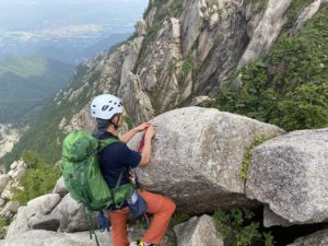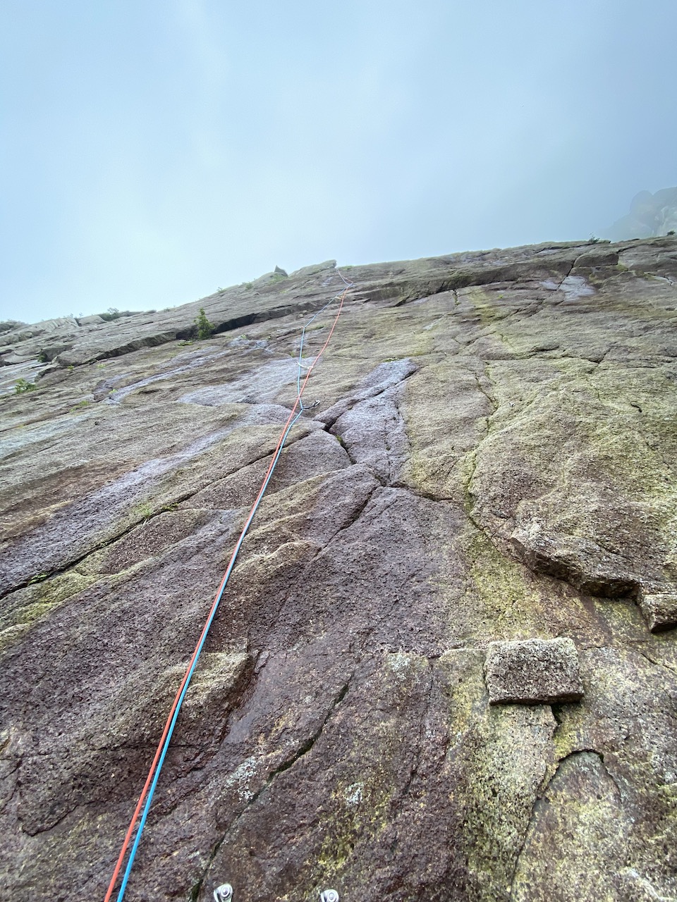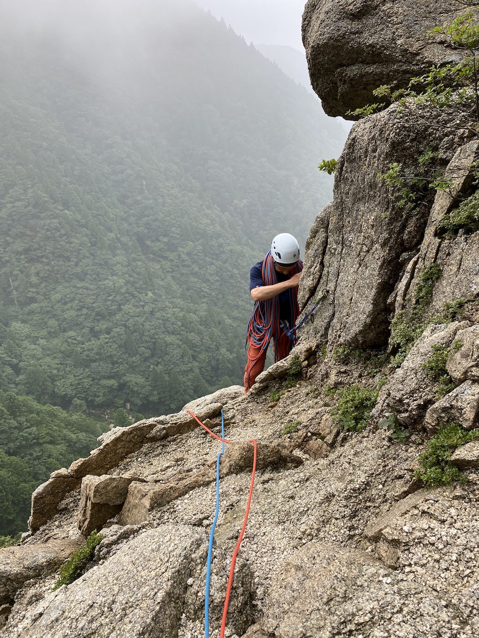 梅雨がなかなか空けずに外岩でのクライミングができない中、雨上がりで少し天候が回復するのを狙って夏山合宿に向けてT井、M戸で藤内壁の岩トレ。今回はT井に終日リードしてもらうと設定した日だったが、一の壁はかなりのルートが濡れていて厳しい状況に。左ルートは下部の濡れがひどく中間のオーバーハング部まで到達できずに敗退。比較的乾いていたダイレクトもリードのT井は途中濡れている岩でやむを得ずA0を使うことに。そしてダイレクトの終了点にT井が買ったばかりの安全環付カラビナを置き土産してしまうハプニング。