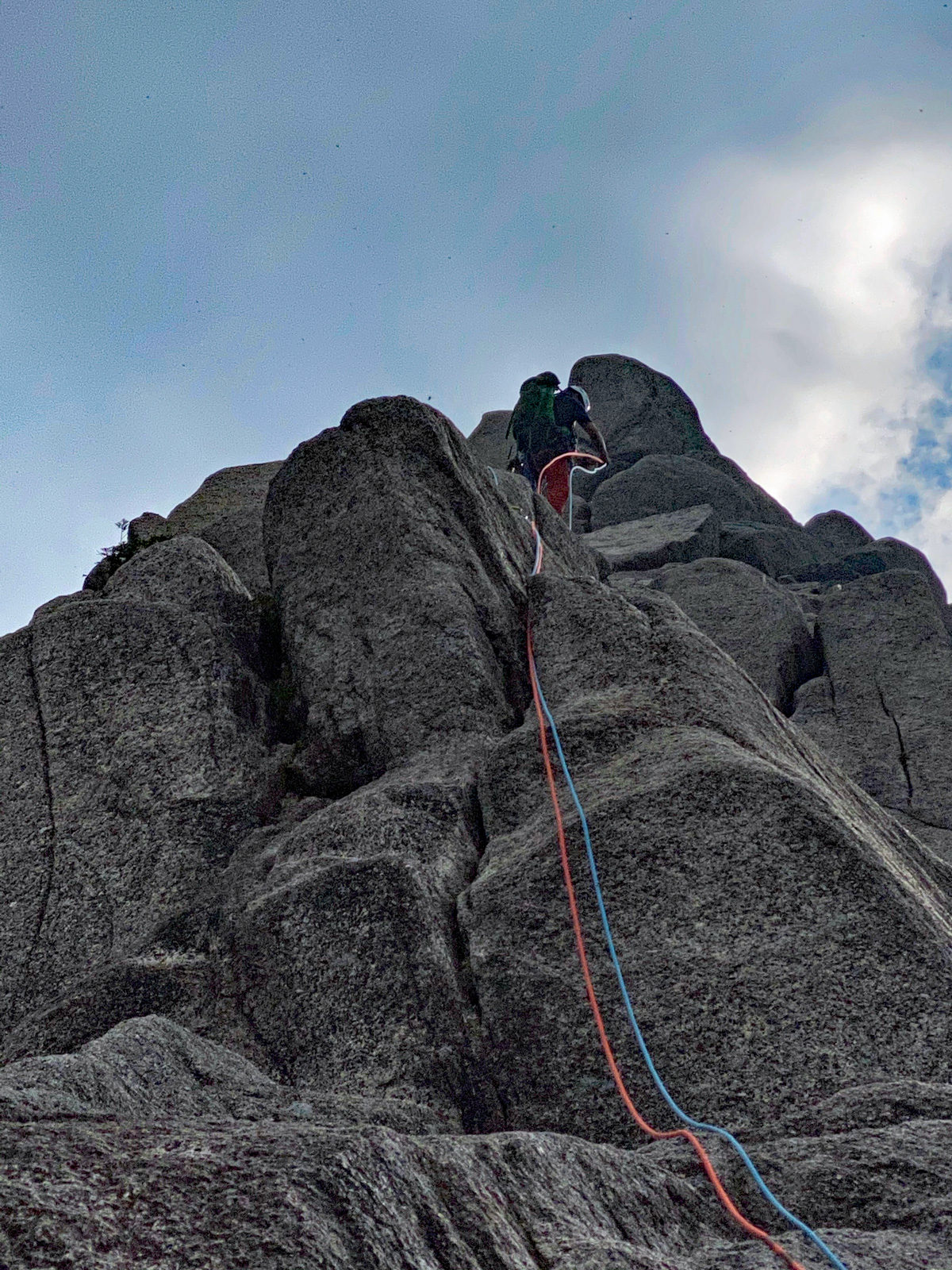 前尾根の登攀も取り付きのP7がかなり濡れていて思いのほか難しく、またT井が持ってきたトランシーバーをM戸が何度もロープに当てて飛ばしてしまい回収に時間がかかる等予想外のハプニング続出だった。登攀中に落とした物をよく回収できたものだ(笑)