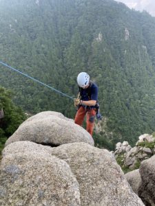 P2ヤグラ終了点で懸垂下降準備中のT井