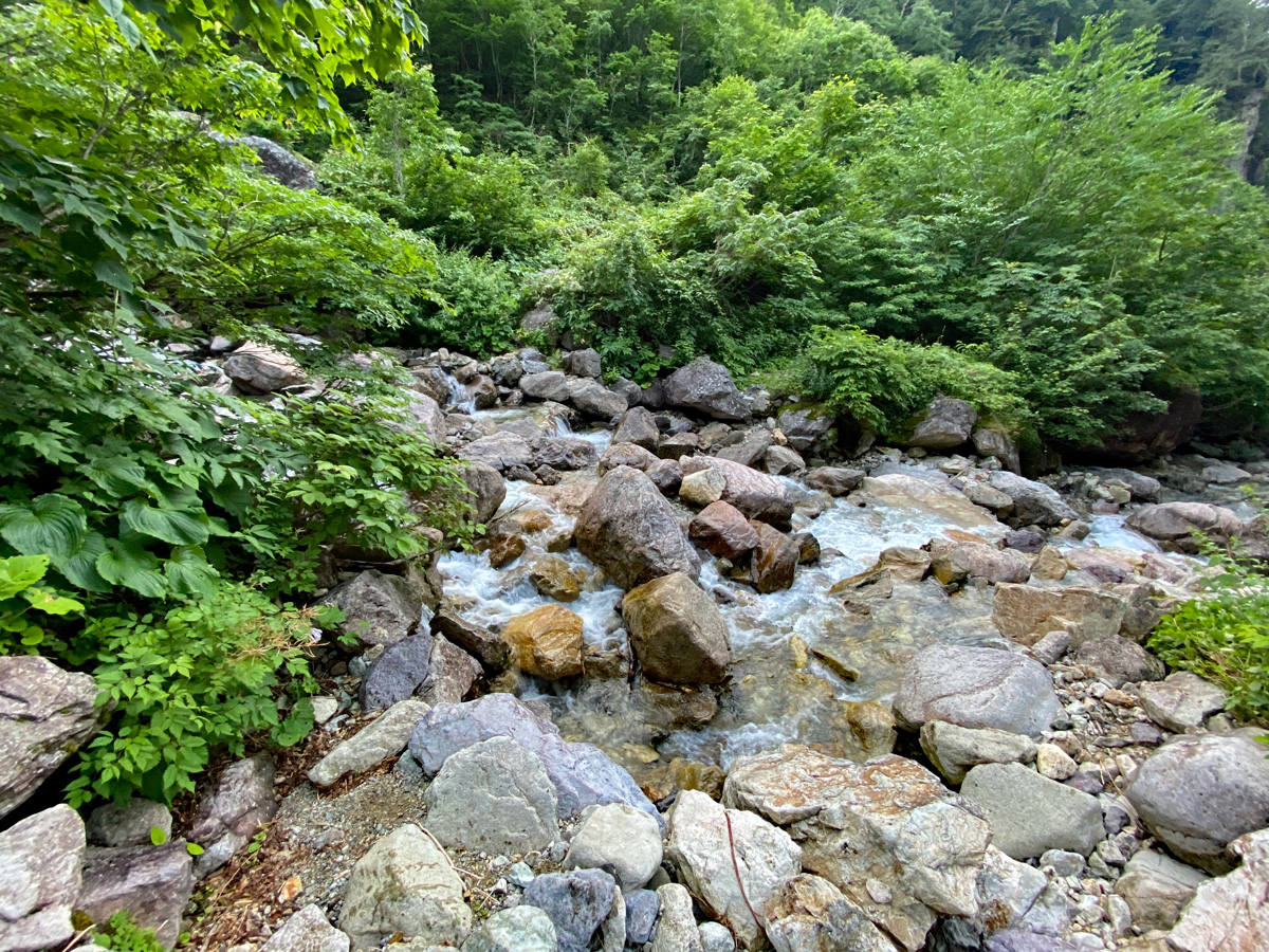 北沢経由で 錫杖岩舍 → 錫杖沢渡渉 → 錫杖沢出合 → 笠ヶ岳クリヤ谷登山道 → 中尾高原口駐車場 下山