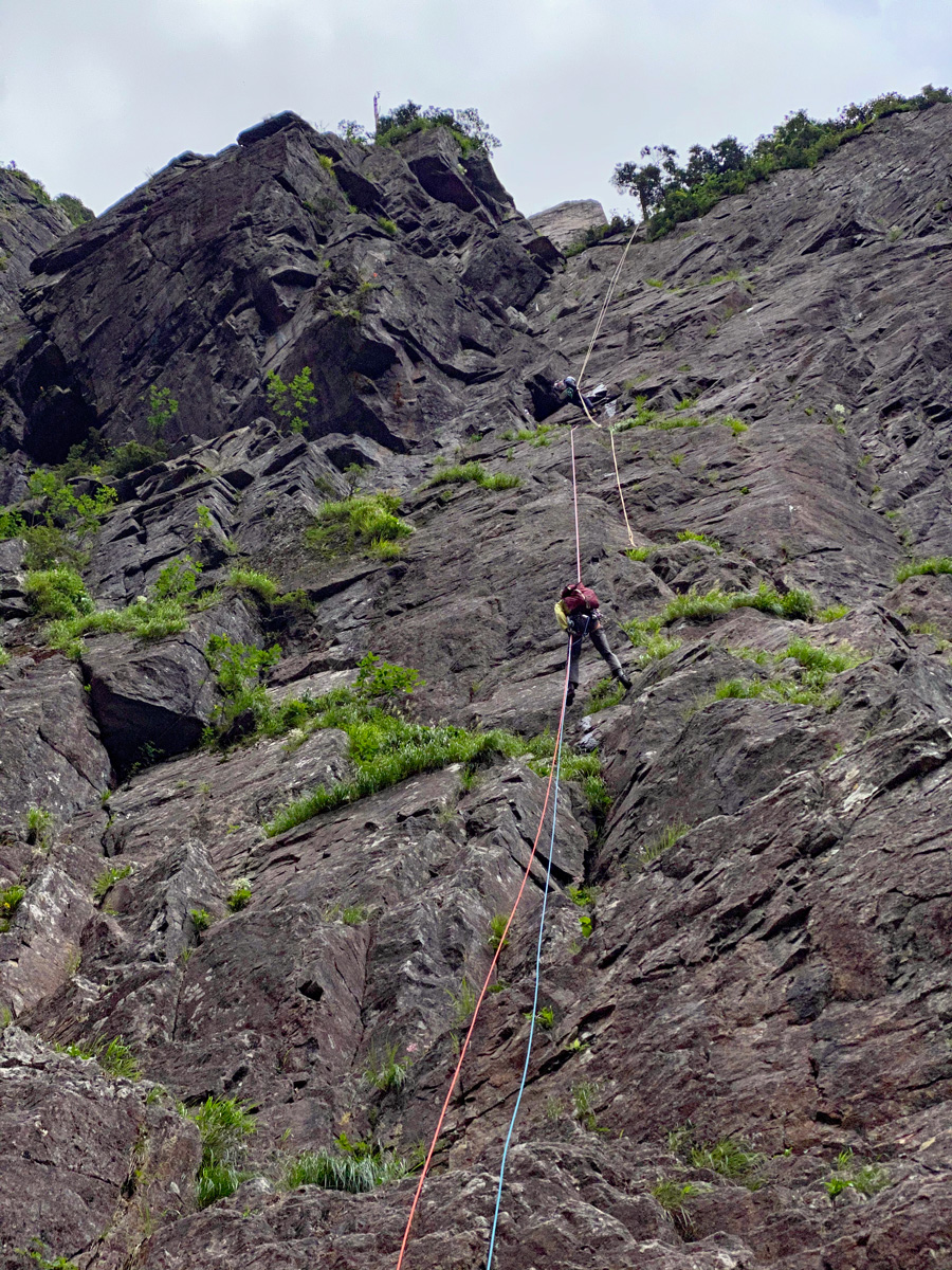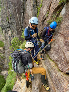 7P終了点で懸垂下降準備中のH藤、順番待ちのT井、O野