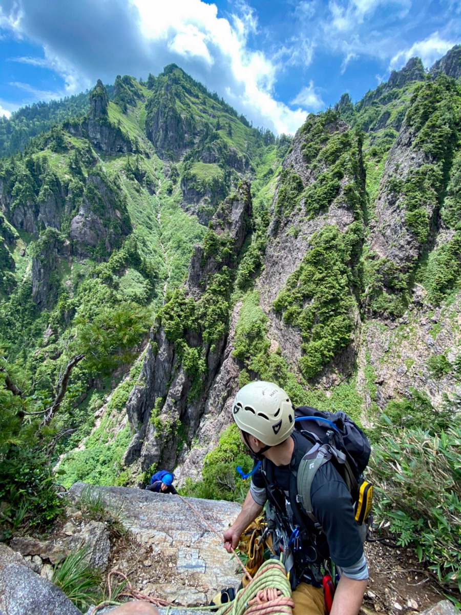 K合会長とM戸がペアに。誰もとりついていない1PからM戸はリードトップで行かせてもらったが、コールが届かない聞こえない、分かりやすいはずのピッチ終了点を超えてロープ一杯の変な所で切る等、最初はもたつきながら後続パーティーにも迷惑をかけてしまった。しかし、つるべで徐々に調子は上がってK合会長のフォローもあって中盤からは追いつかれず登れた。7Pは最初の核心部に苦労したがA0で何とかクリア。後で聞くとK合会長とH藤はフリーで登れたとあって悔しかった。4時間目標が約5時間越えの時間がかかったので、よりスムーズなクライミングとロープワークがM戸の今後の課題。懸垂は北沢側フランケの垂壁でのロープ掛け替えは高度感にシビレた。
