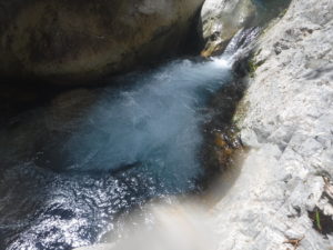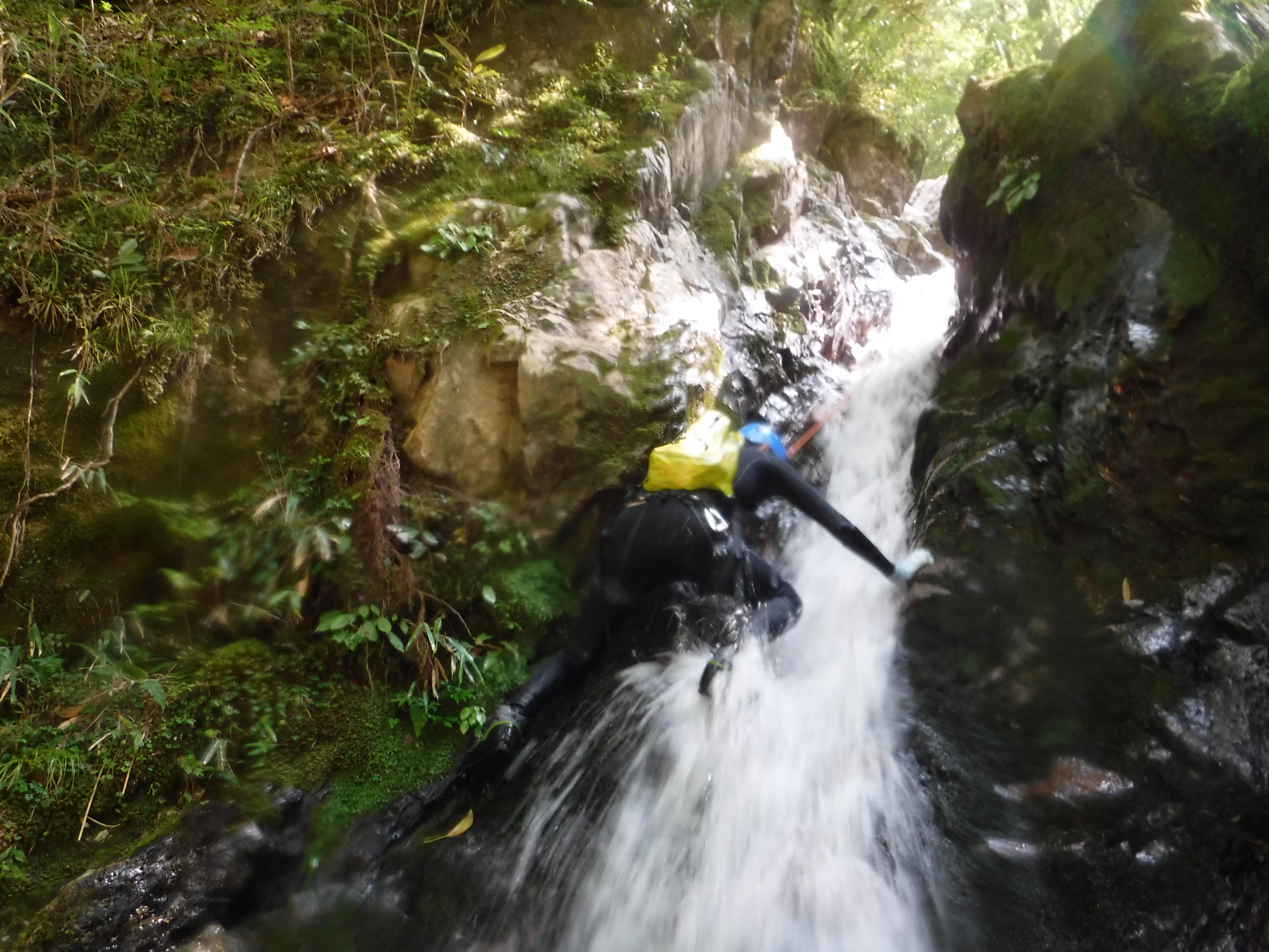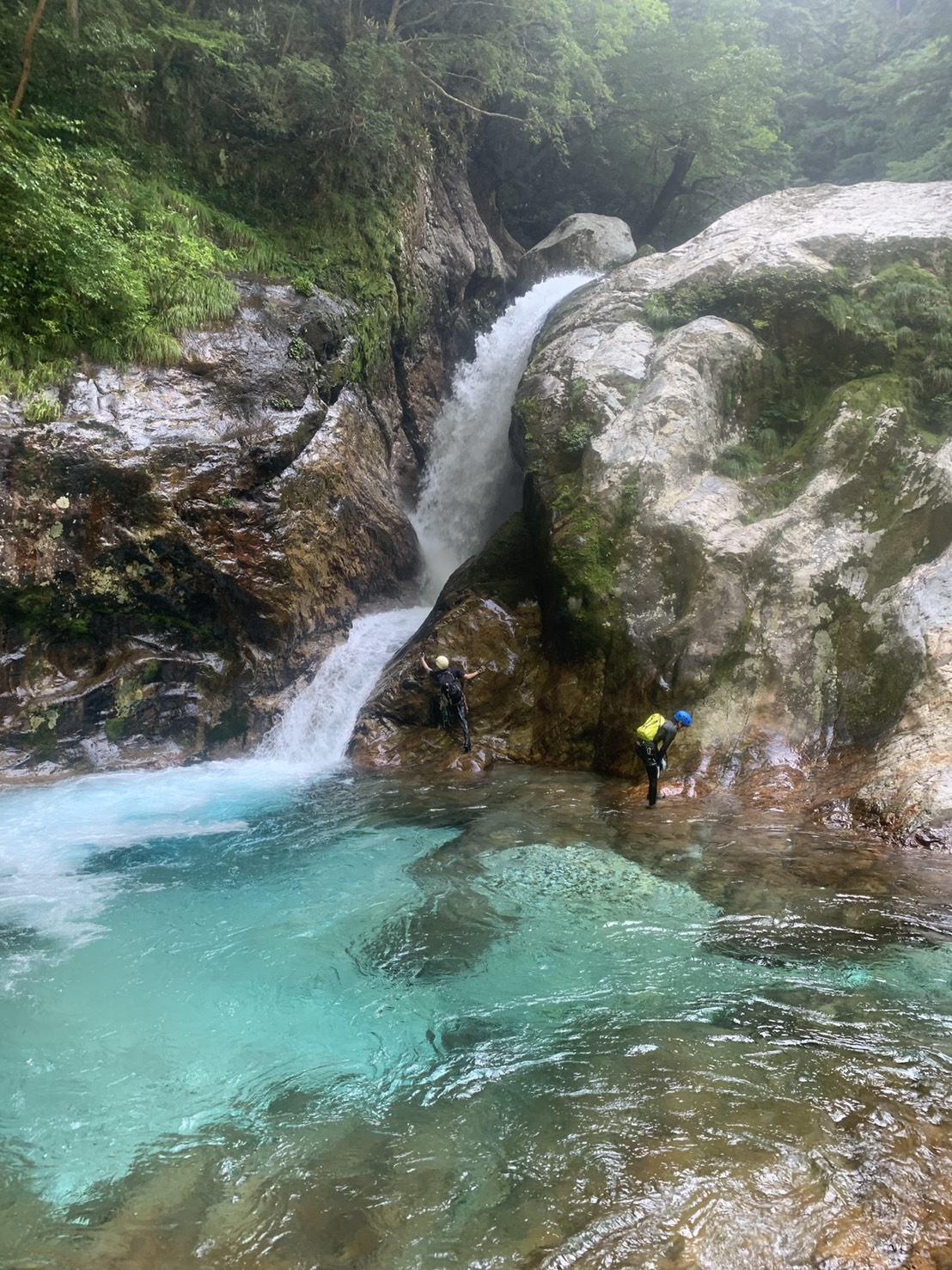 ガードレールの隙間から斜面を下りすぐに入渓。支流を10分程下ると前鬼との出合いへ。F間氏はこの時点で沢の水の綺麗さに感動。そこから30分程すると10m二段の滝へ到着。ここはまさに前鬼ブルー!滝のスケールと滝壺の釜の綺麗さにテンションアップ!