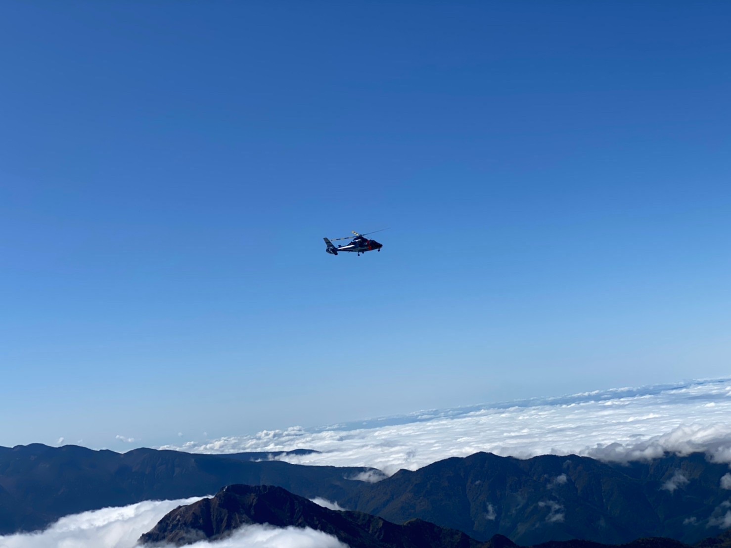 山頂について写真を撮ったり、おにぎりを食べたりしているとヘリが間近に。