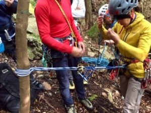 ビギナーがリードで登り、クリップや支点の場所を考えるという流れ。