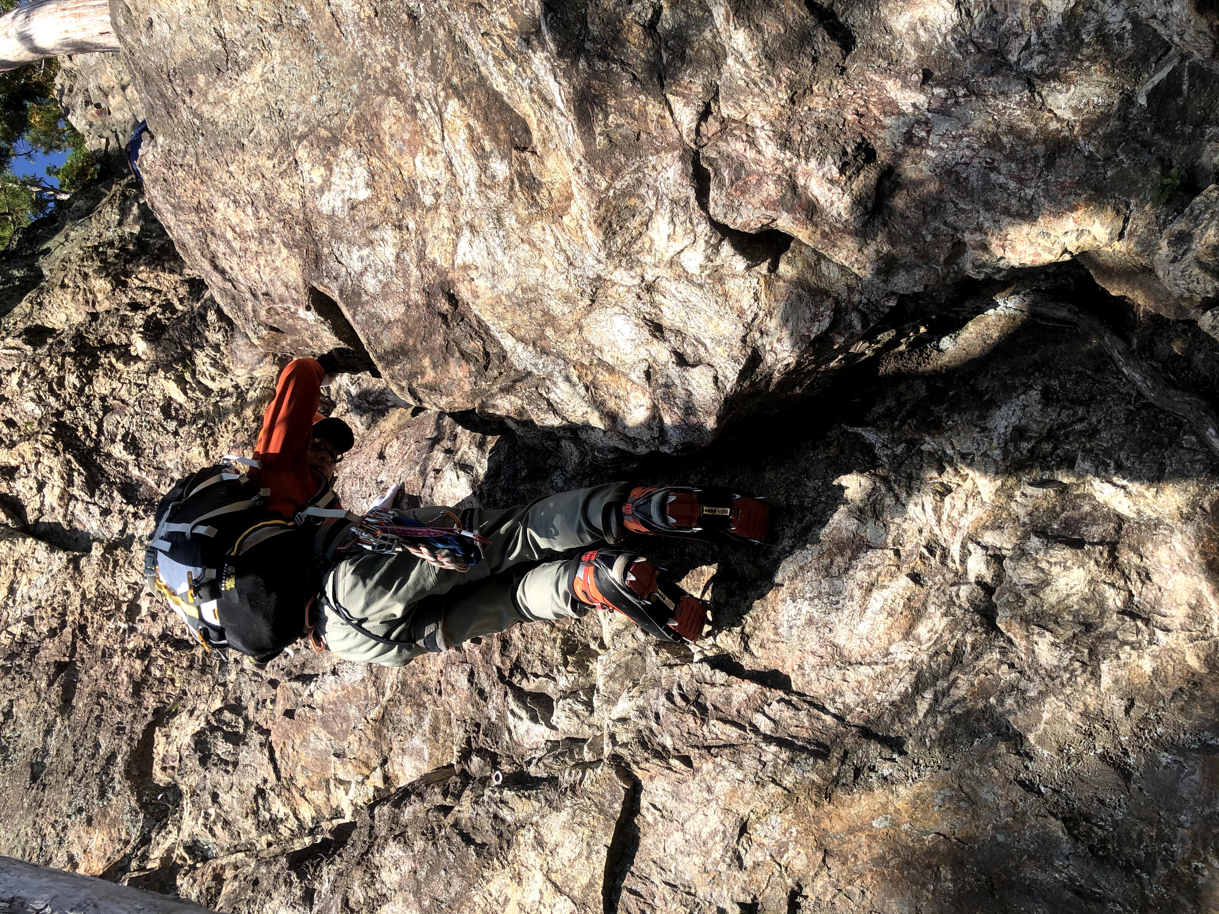 Y懸尾根取り付きに着いて軽く昼食をとり、次は北尾根取り付きへ。M戸さんリードで、3人でのマルチピッチクライミング。やはり、重量を背負っての登攀はかなりの緊張を強いられる。足元が不安なのでどうしても手の方に力が入ってしまう。ここでもしっかりと前爪をかける意識が必要だということを痛感した。
