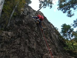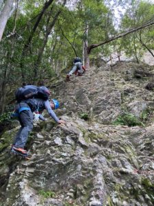 Y懸頭到着後、すぐに下山開始。登りよりも、やはり下りのほうが怖い。急坂を上から見下ろすだけで憂鬱になる。下りでは何個所かロープを出してもらった。