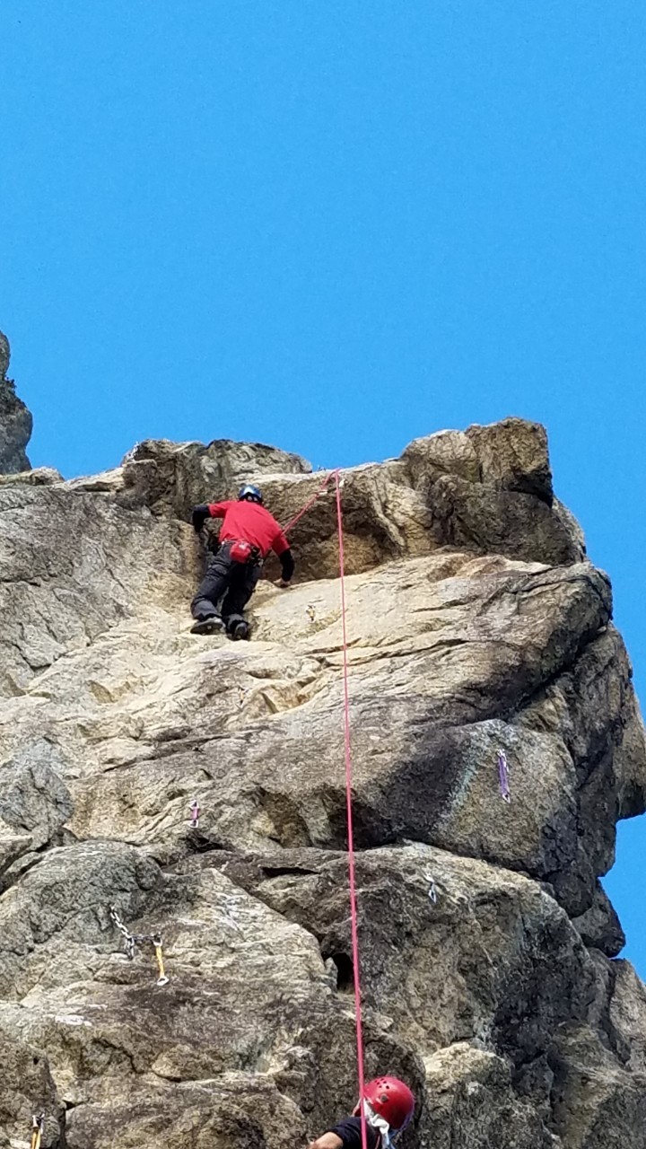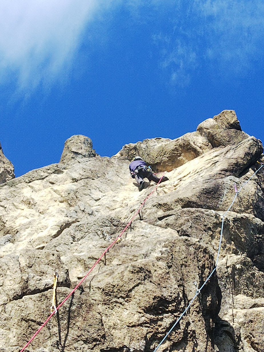 早めに岩場に着きましたが、すごいクライマーの数、、、ますはお手本としてK林さんに「バブフェイス:10a」をリードいただきました。余裕でスイスイですね~!↑