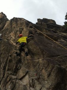 続いてトップロープで順番にトライ。まずはI口が頑張りますが、乗越手前でテンション、アキマヘンがな、、、↑