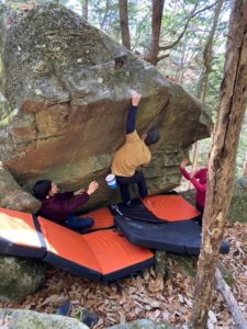 Y本さんの諦めない姿やH籐さんの完登に勇気づけられ、限界まで続けた結果、最後のトライで右手が滑り、頭から落下、そのままマットを滑り落ちてあわや頭を岩にぶつけそうになった所、N澤さんのナイススポットで両手で頭を抱えるように止めてもらえました。