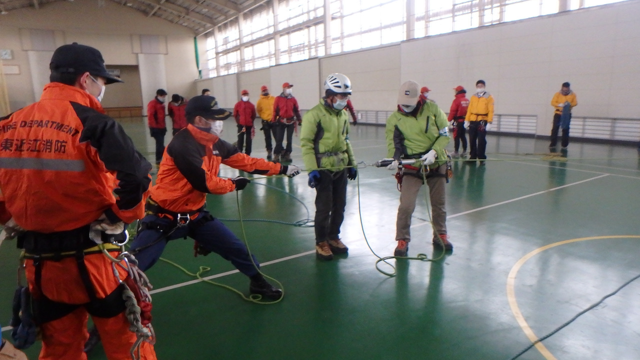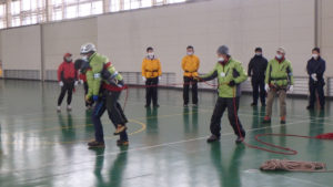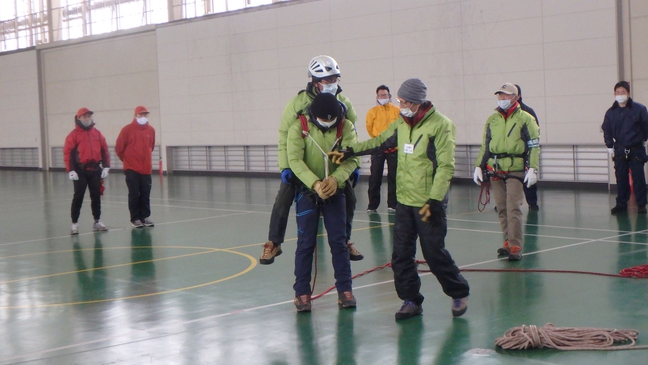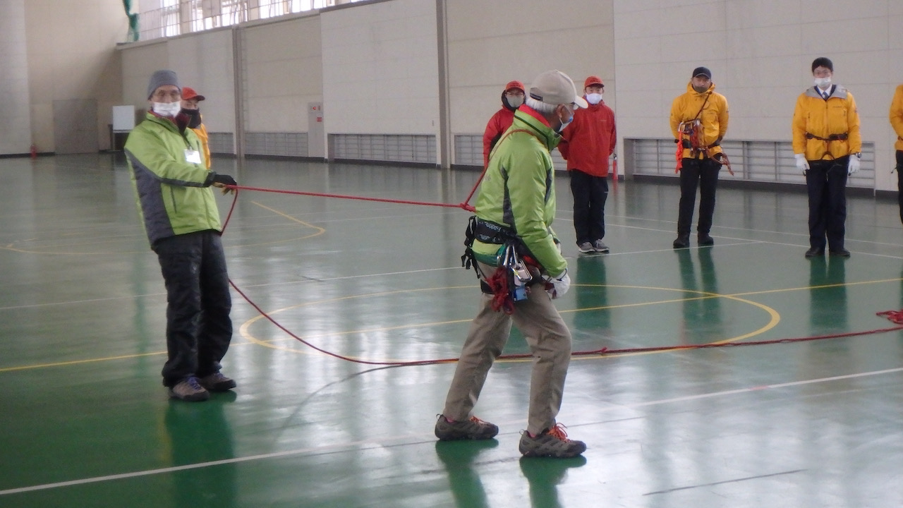 要救助者が歩ける想定のショート・ロープ確保。要救助者にクライミングロープをもやい結びで結び、後からショート・ロープで確保する方法を実演及び実技を実施。これは近隣地域の山岳遭難救助中の要救助者の死亡事故事例から訓練必要と判断し組み込まれた。